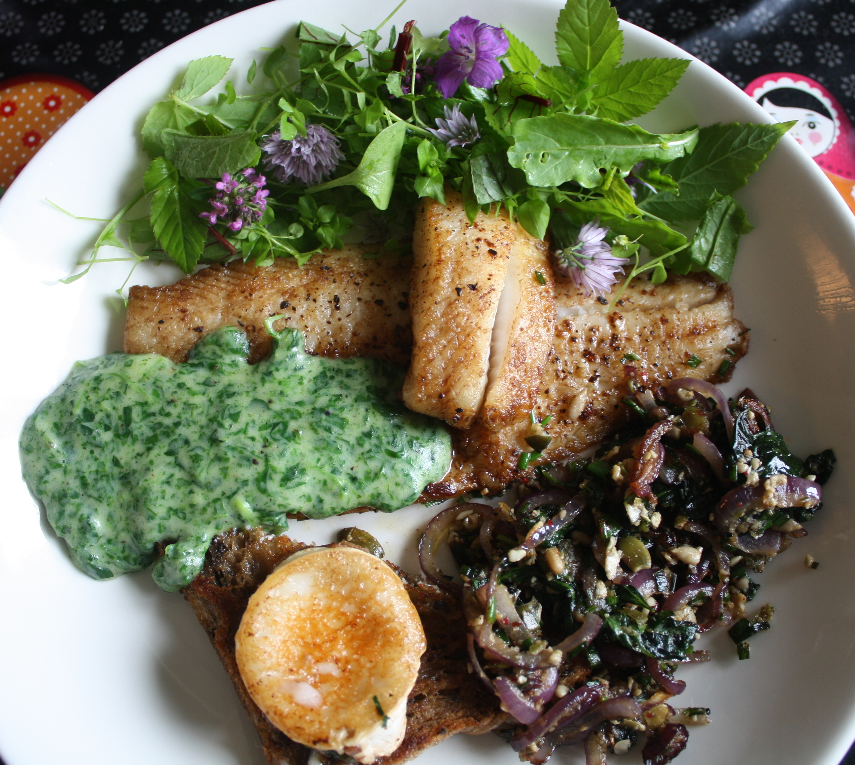 Lautasella tällä kertaa paistettua kuhaa, nokkosmuhennosta, pähkinäistä jauhosavikka-punasipulipaistosta, villiyrttisalaattia ja voissa paistettua mallasleipää & vuohenjuustoa.