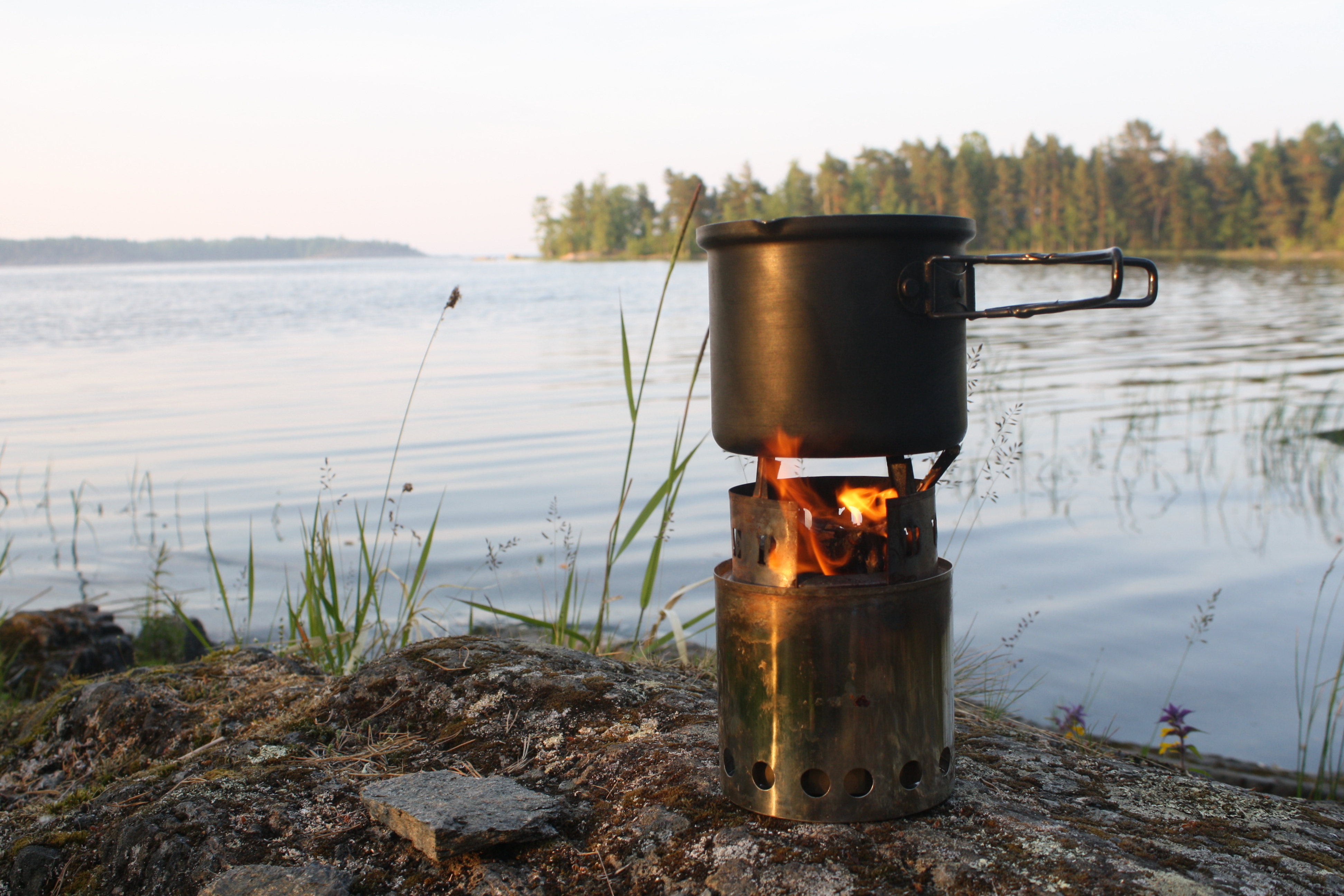 Keittimistä ehdottomaksi suosikiksi on noussut risukeitin Bushcooker, jossa minulla kulkee mukana Primuksen pieni kattila ja paistinpannu, joka toimii myös kantena kattilaan. Koko viritykselle olen ommellut nahkaisen säilytyspussin, jonne mahtuu lisäksi sytykkeitä (itse suosin tuohta) ja tulitikut. Kun on tuohta mukana, tulet saa syttymään kosteallakin kelillä. Kyllä sen verran aina löytyy palavaa risua jostain.