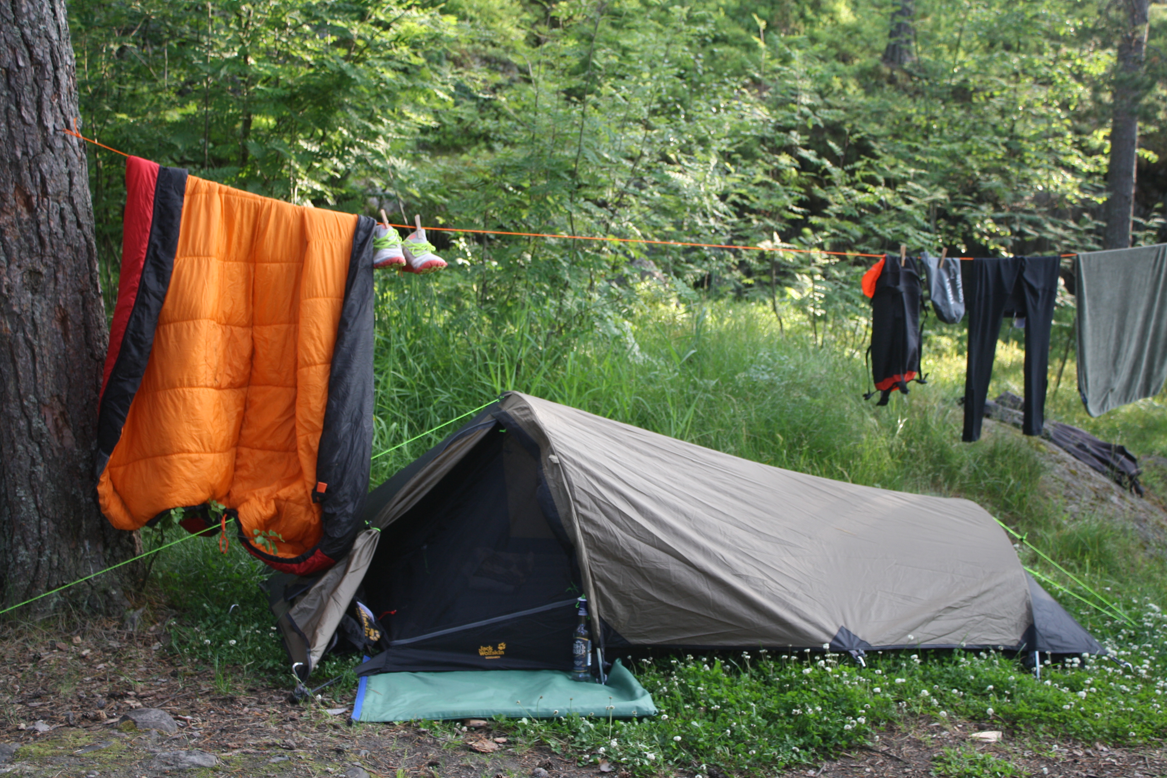 Telttana on yksin yöpyessä kätevä Jack Wolfskinin yhden hengen majoite. Pakkauskokokin on niin pieni, että mahtuu kajakin tavarasäilöön. Eihän se mikään viihtyisä oleskeluteltta ole, mutta ajaa asiansa yöpymiseen. Vaatteidenvaihto on aika hankalaa sisätiloissa matalan korkeutensa takia.