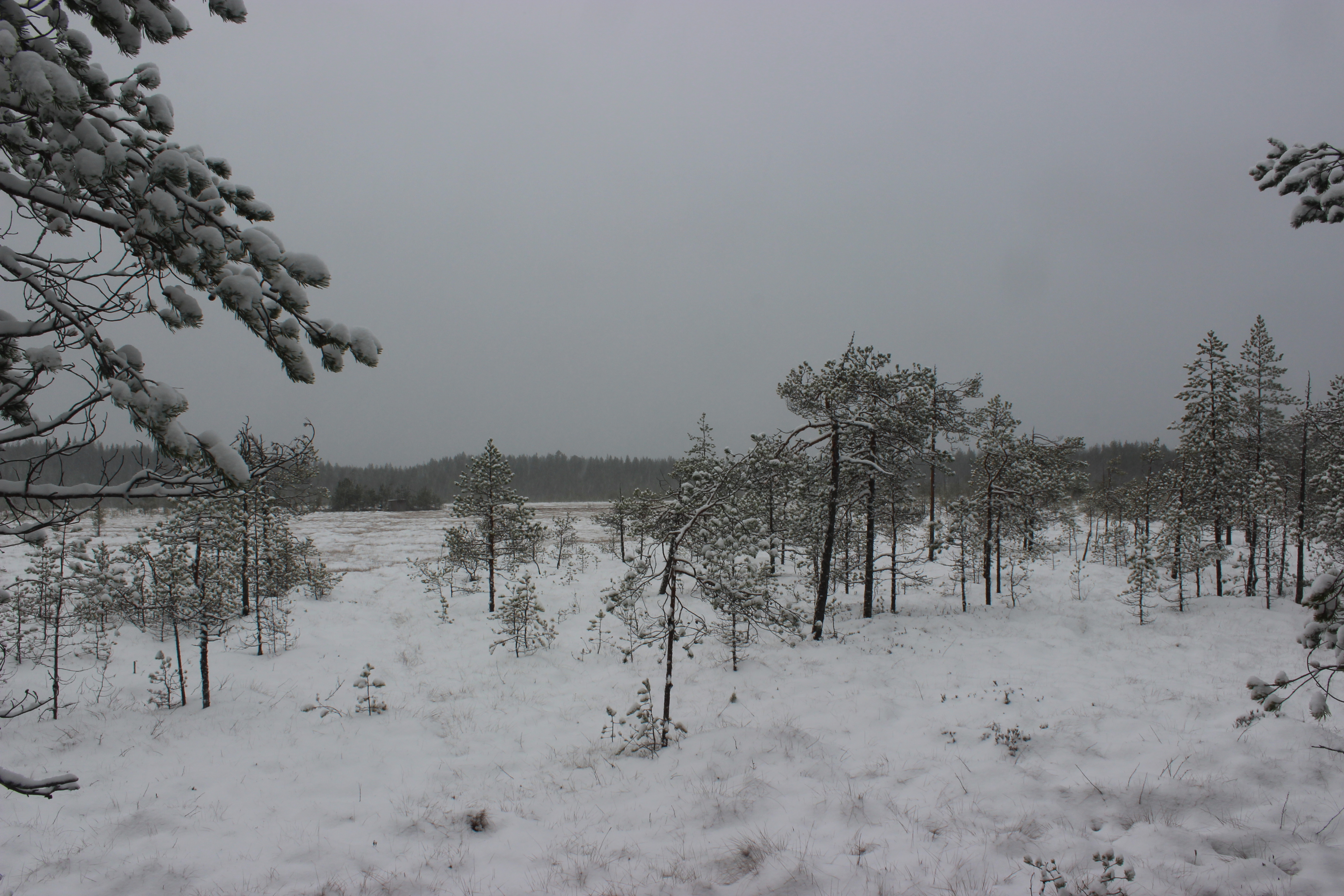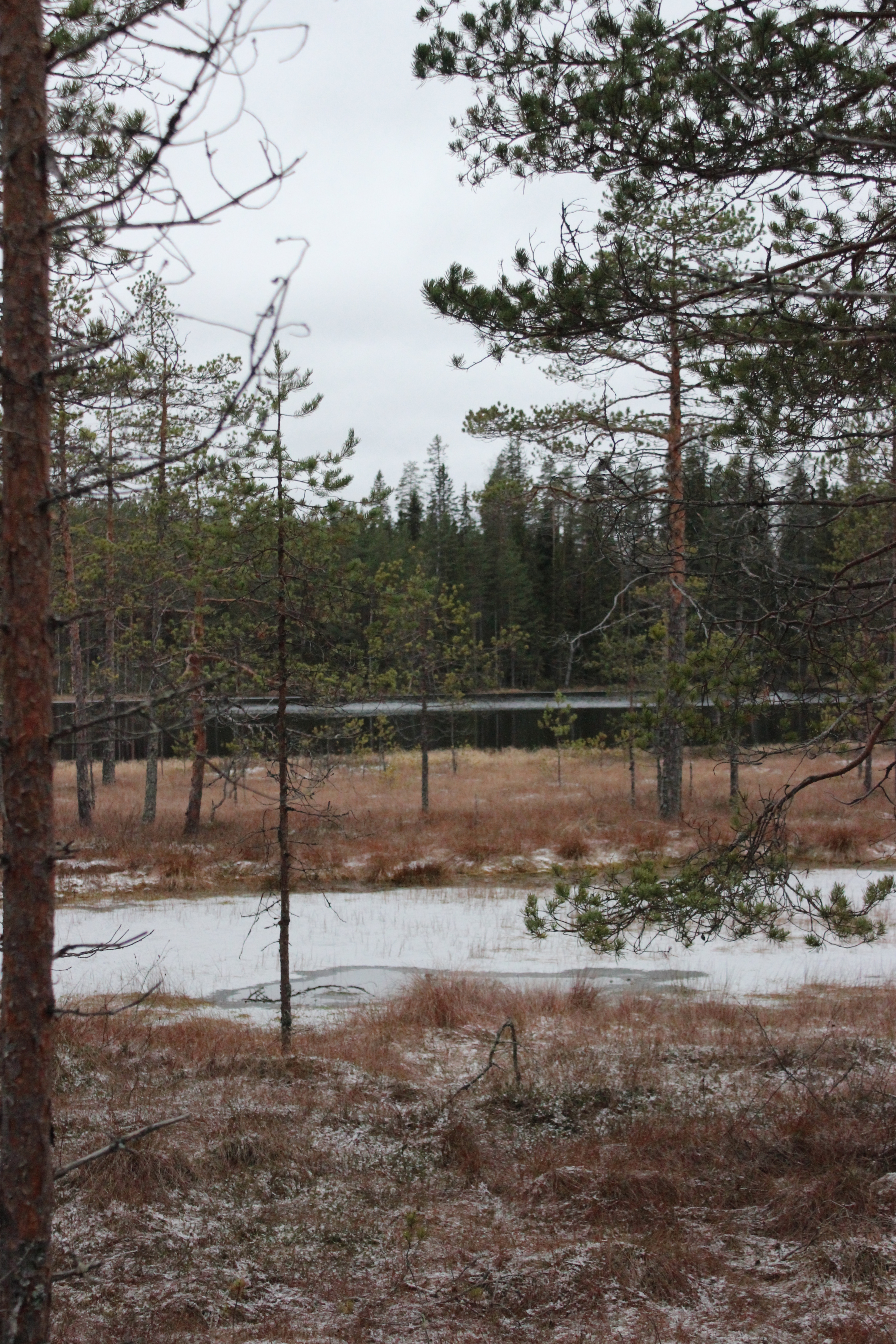 Lähdimme reitille myötäpäivään. Heti alussa oikealle jää iso suo, jonka keskellä on lintujen tarkkailuun tehty koju. Suon ylittävät pitkospuut. Pienet kitukasvuiset männyt töröttävät siellä täällä suolla. Jos astuu ohi, kastuu jalat. Suo on sen verran upottavaa sorttia.