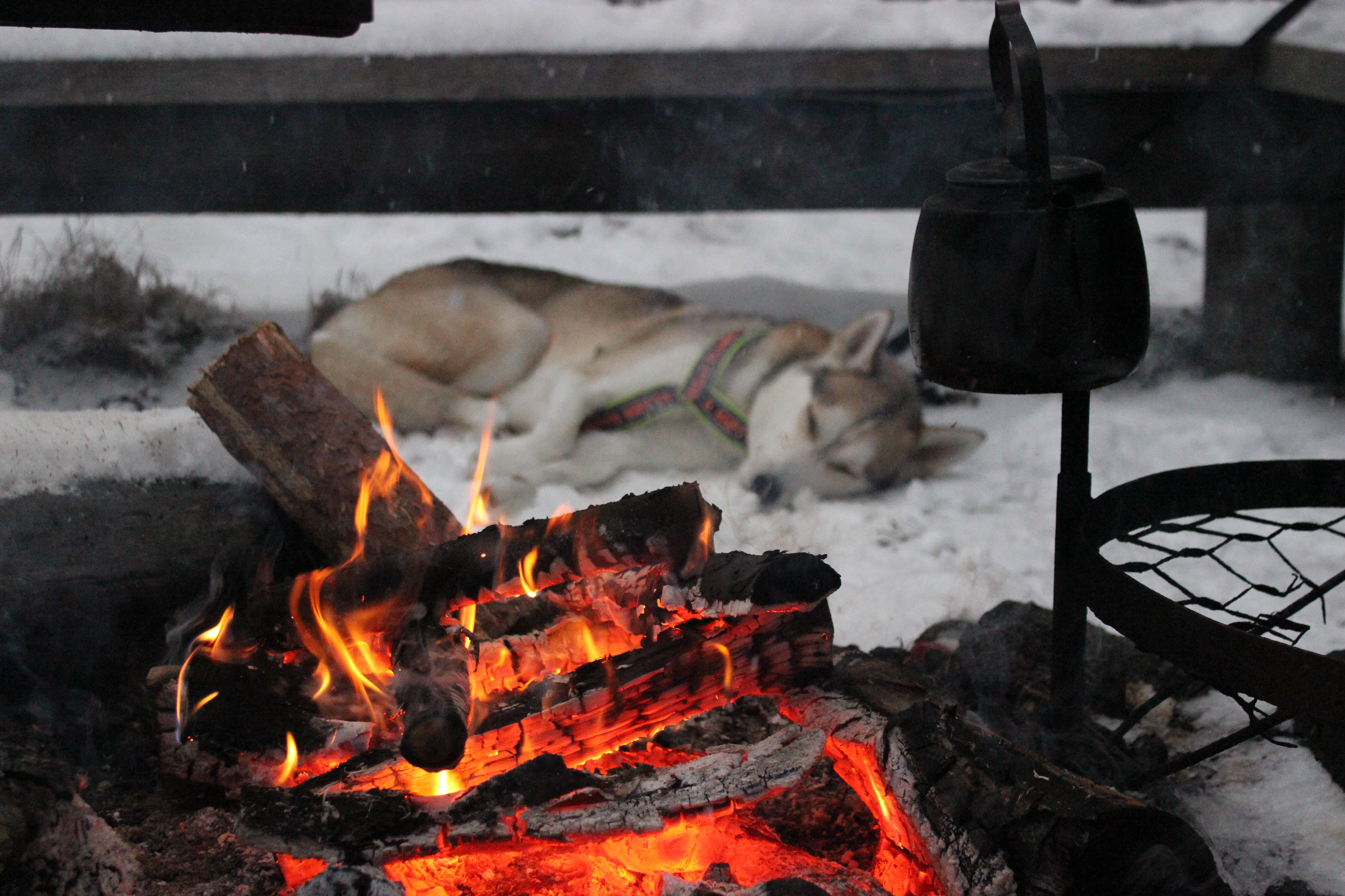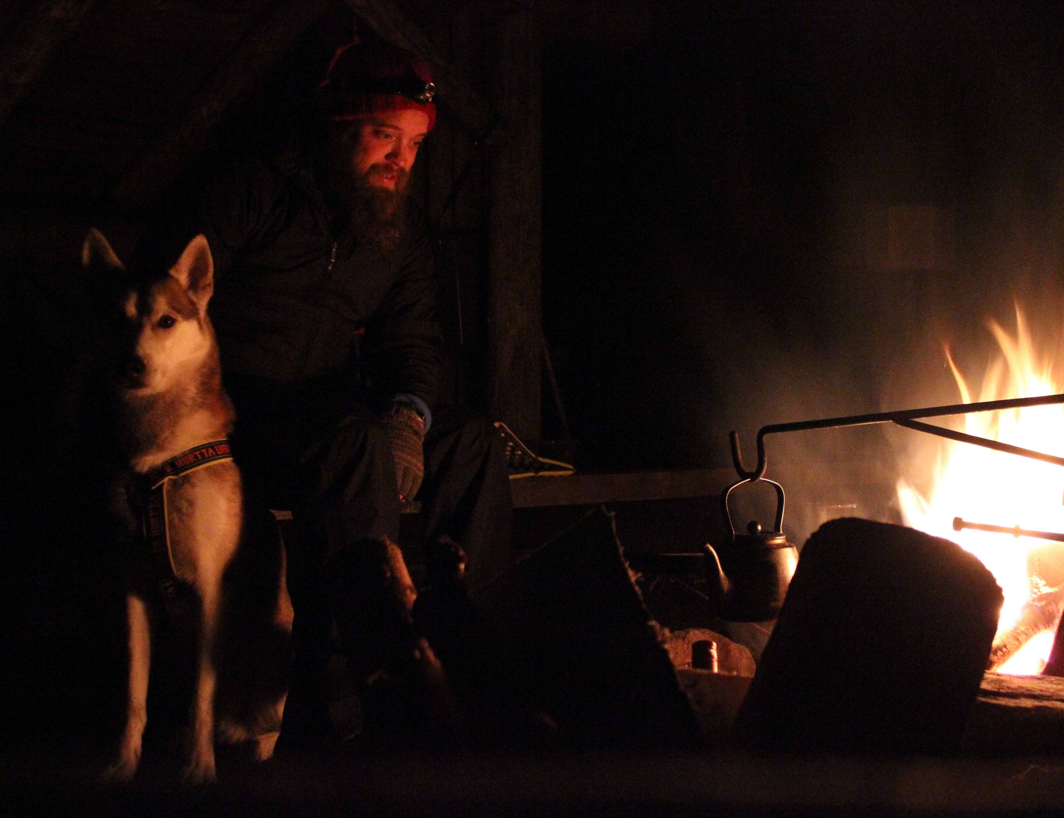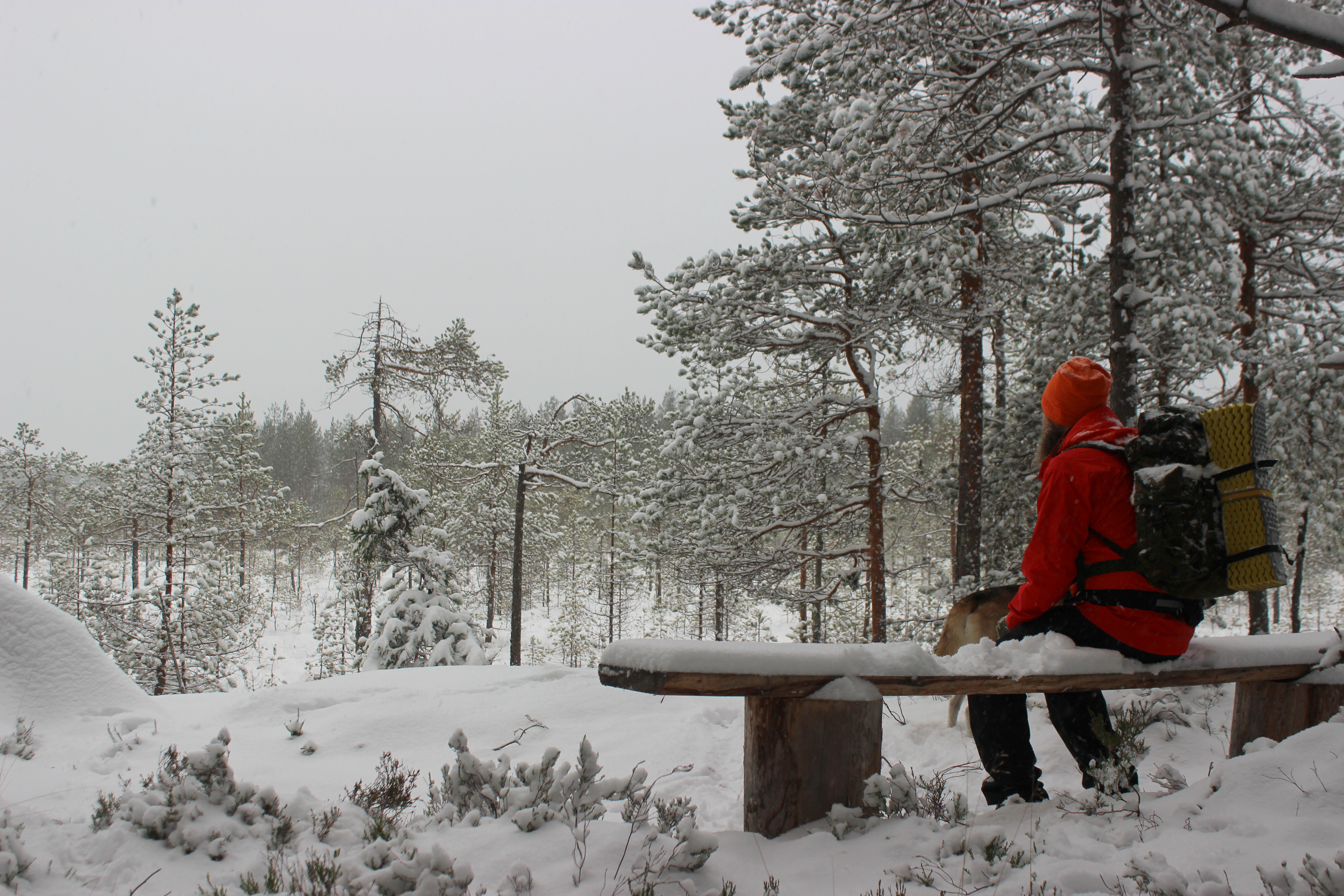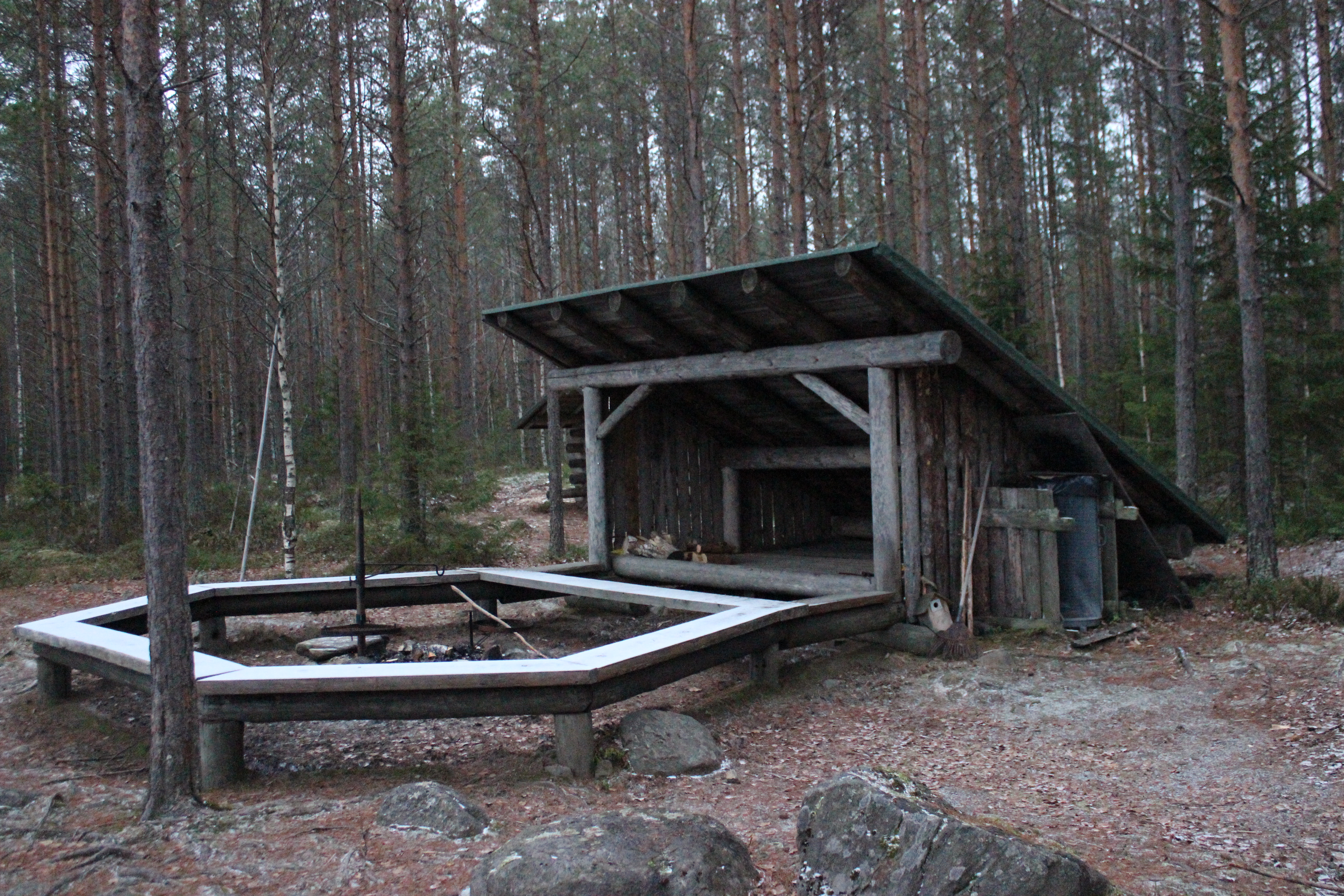 Suunnilleen puolivälissä reittiä on taukopaikka. Laavu, kuivakäymälä, puuliiteri ja nuotiokehä sijaitsevat Teerijärven rannalla. Liiteri oli suloinen kuin karamelli ja aivan täynnä puita. Huussissa oli Soft Emboa! Laavua ei selvästi oltu ajateltu yöpymiseen. Sen seinät oli rakennettu harvasta laudoituksesta ja lattialankkujenkin välissä oli sentin raot. Virittelimme erätoverista pesän laavuun. Sillä tavalla saimme sopivan tuulensuojan aikaiseksi. Hyvin uni maittoikin. Yön aikana satanut lumi vaimensi loputkin äänet maisemasta ja makasimme untuviin kääriytyneinä 12 tuntia.