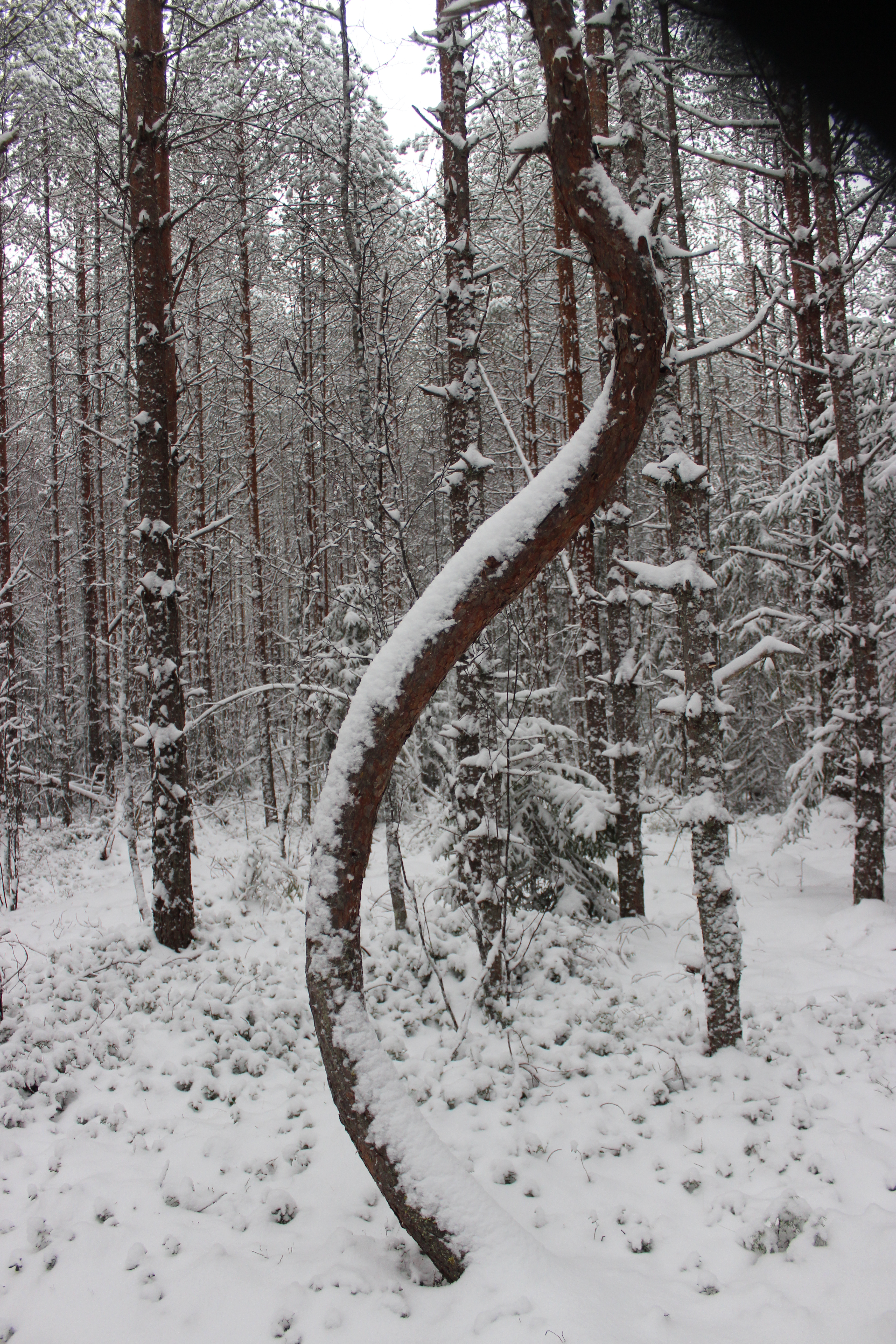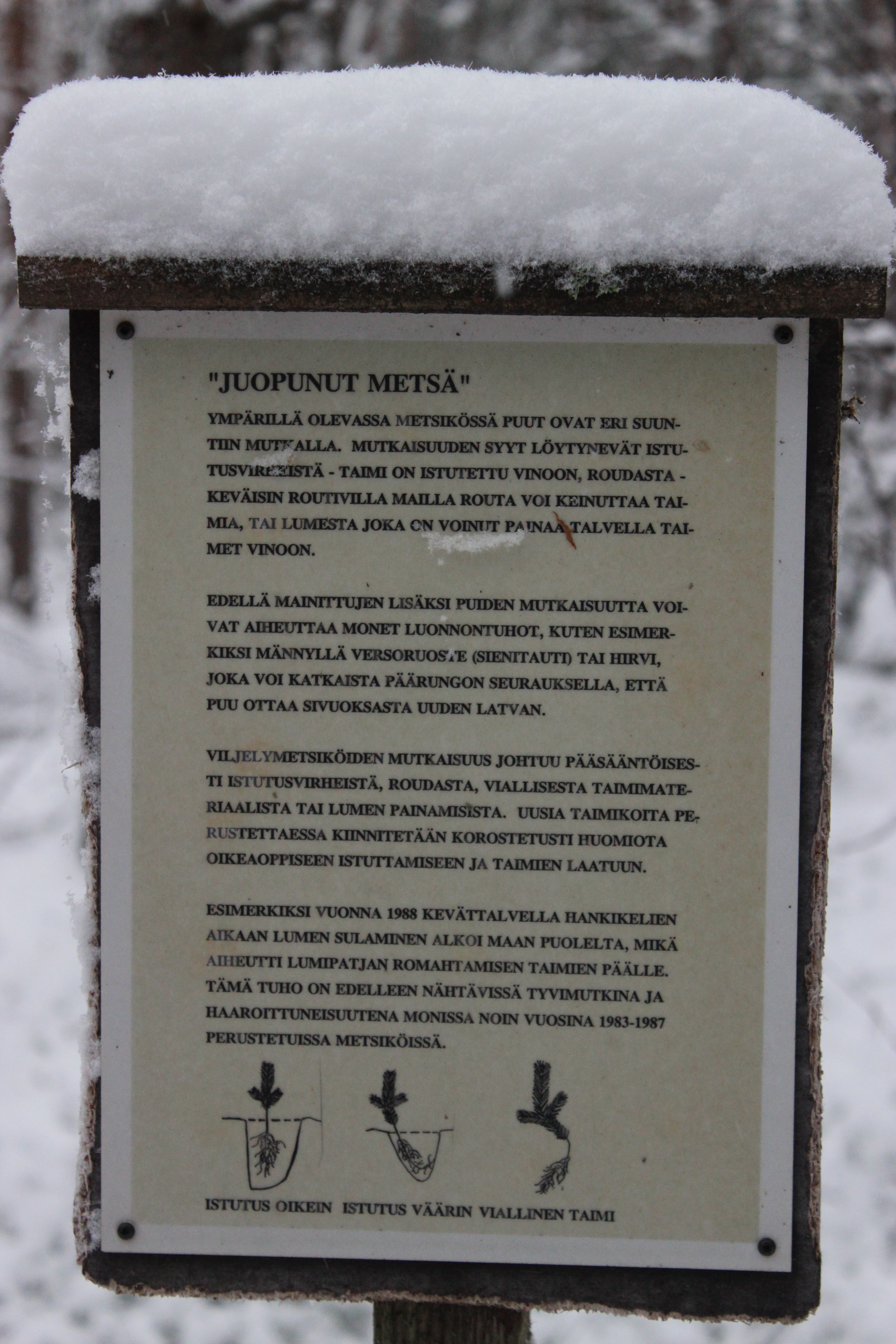 Hauska erikoisuus reitin varrella on myös juopunut metsä hutikassa huojuvilta näyttävine mäntyineen. Keimailevia puita on yllättävän paljon.