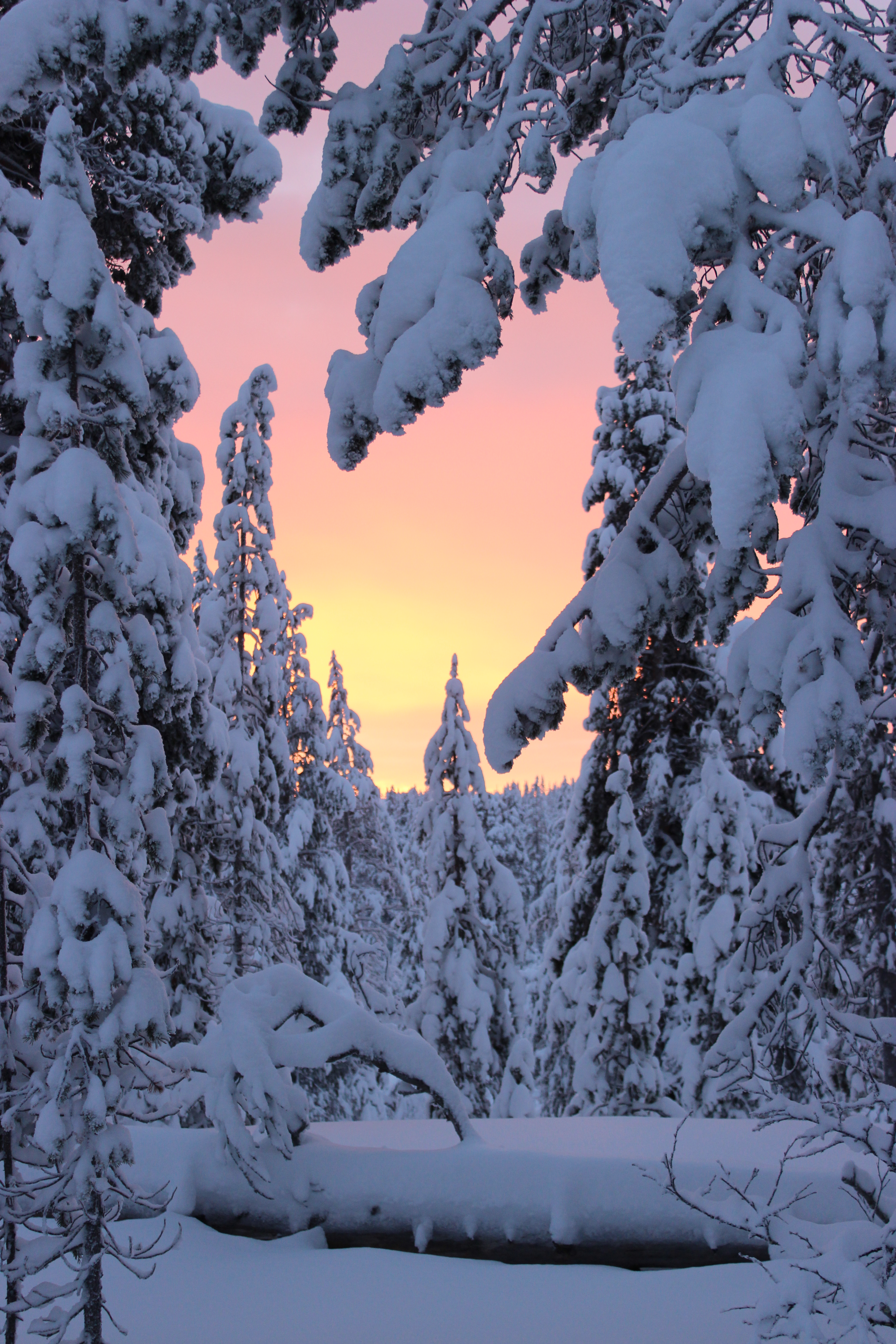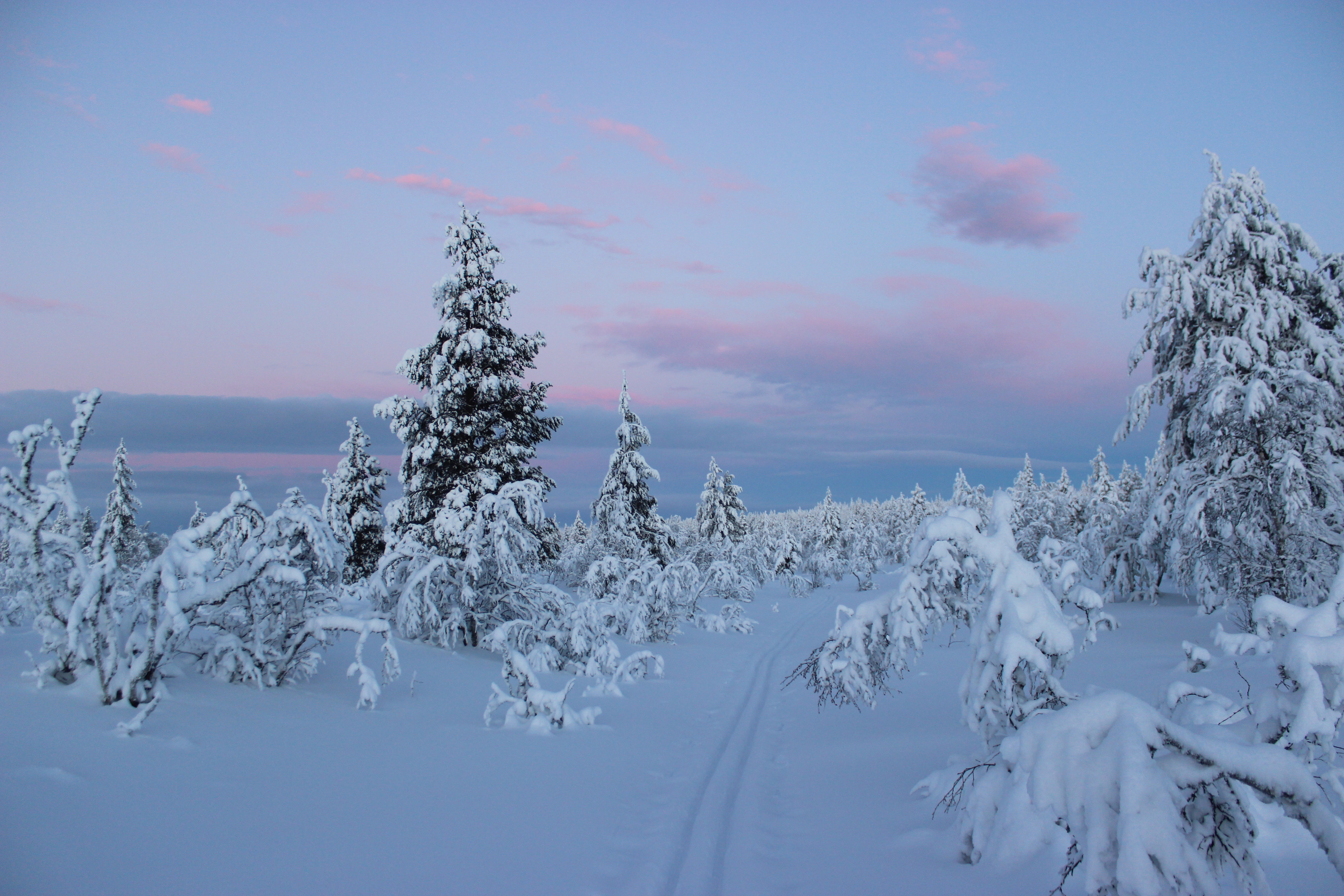 Kävin ihmettelemässä miten pimeä se Lapin kaamos oikein on. Tulin siihen tulokseen, että ei ole pimeä. Valo hohti valkoisista hangista ja valo vaihtoi väriä hetki hetkeltä.