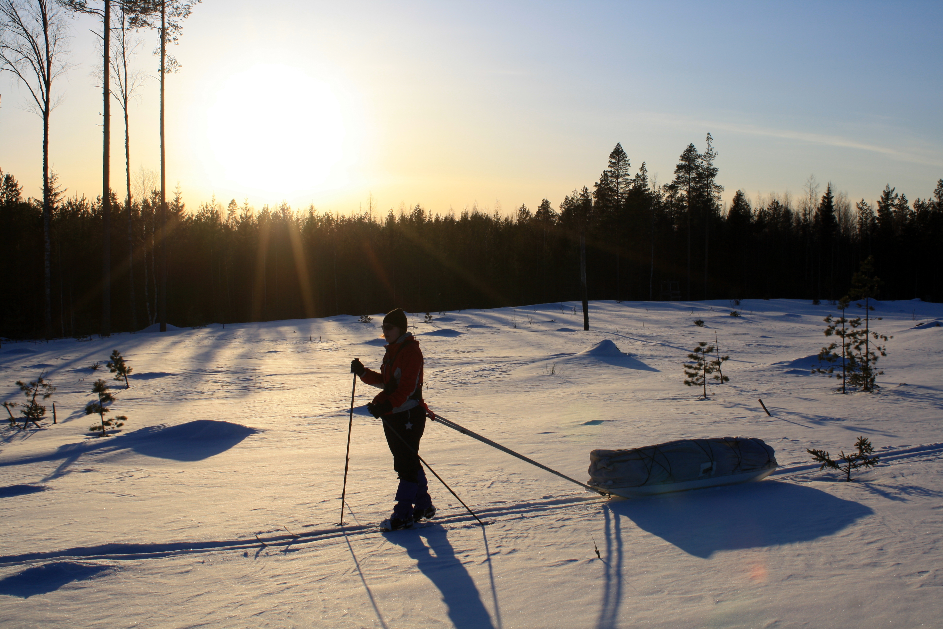 En tiedä mitään niin kaunista, kuin täysin valkoinen maisema ja keskellä valkoisuutta ihminen suksimassa ahkio perässään. Suksi luistaa ja ahkio liukuu perässä vaivattomasti. Aurinko paistaa ja hiihtäjän poskia punoittaa.