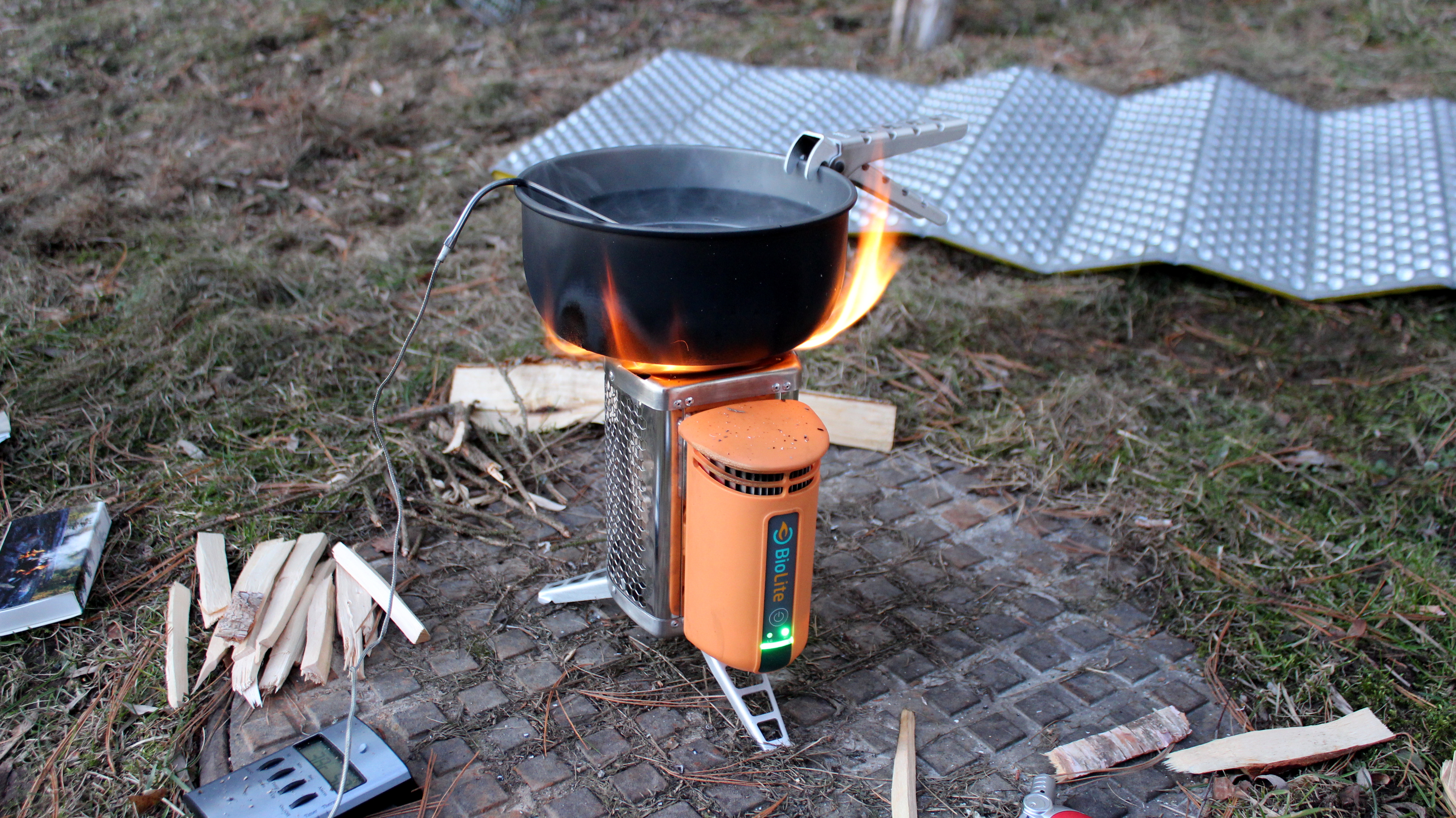 Seuraavana olikin Bioliten risukeitin. Keitin on siitä jännä, että siinä on akkukäyttöinen tuuletin kyljessä. Tuulettimen akku latautuu palamisen tuottamasta lämmöstä ja sillä voi tarvittaessa ladata vaikka puhelinta USB-johdon kautta. Keitin on aika uusi, eikä sitä ole todellisissa retkikohteissa tullut mukana pidettyä. Lyhyillä reissuilla tänä talvena on sillä kahvit muutaman kerran keitetty ja uskomattoman pienellä puumäärällä kaiken saa aikaan! Tuulettimen päälle laittamisen jälkeen liekit vallan villiintyvät!