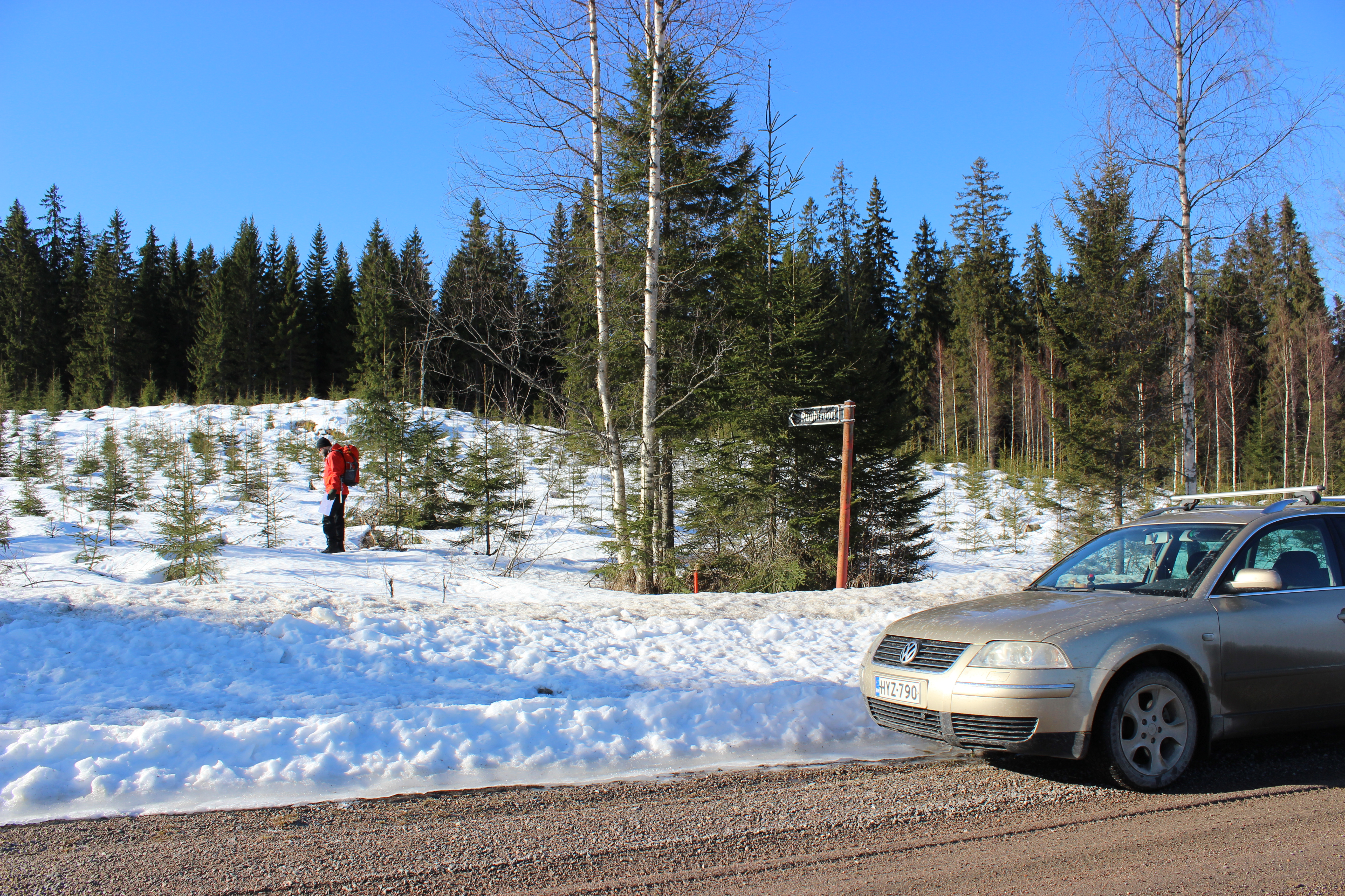 Keväinen aurinko ja hankikantokelit houkuttivat lähtemään retkelle. Jämsän Rotkojärvi oli katsastamatta, joten sinne lähdettiin. Netistä löytyi ajo-ohje, jossa neuvottiin ajamaan Jämsästä 10 kilometriä Halliin päin ja kääntymään sitten Palsinaan. Risteyksestä piti olla 10 kilometriä Ruuhivuori-kyltille, mutta todellisuudessa matkaa oli vähän alle 6 kilometriä. Auto piti jättää tien varteen.