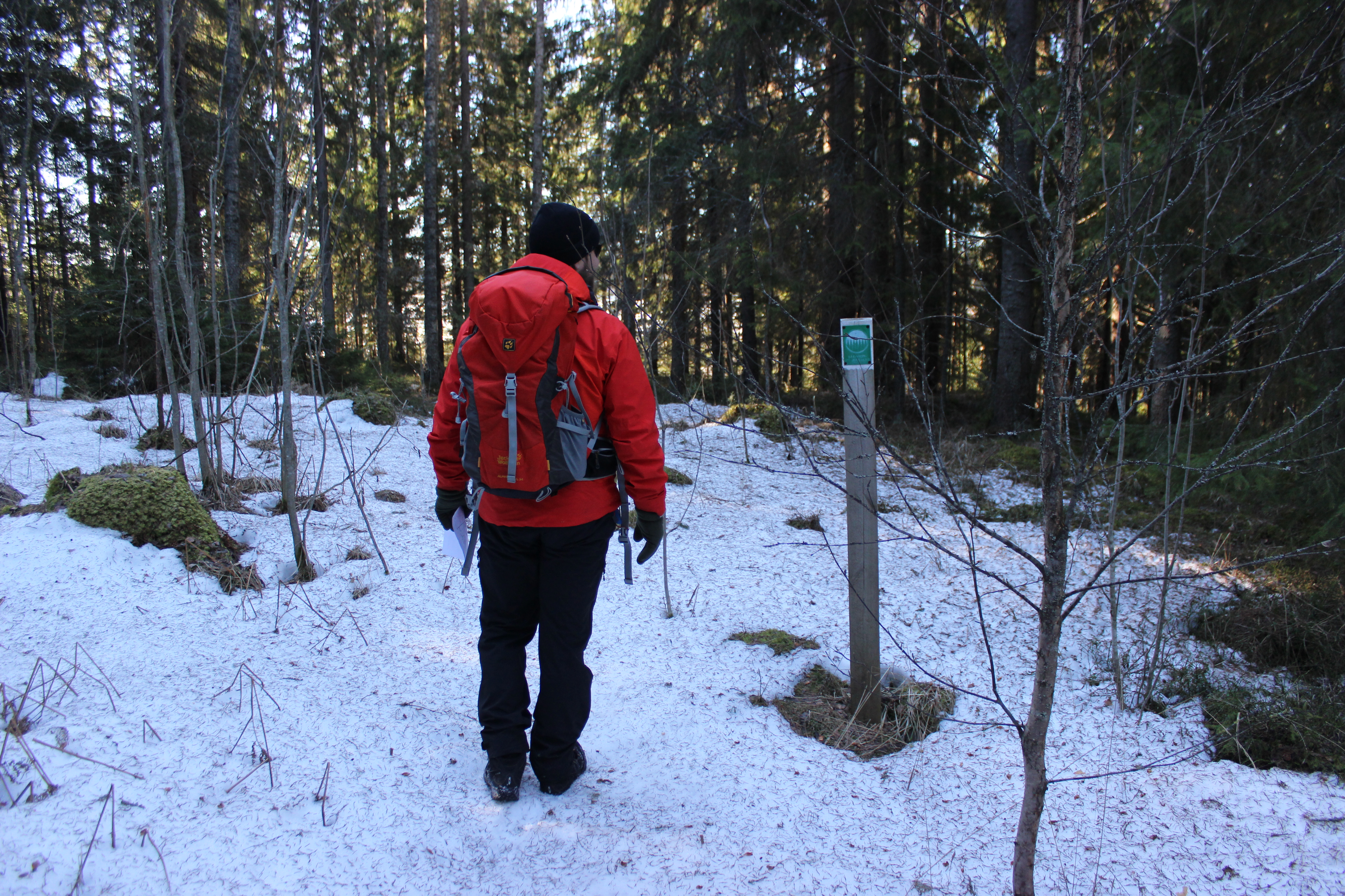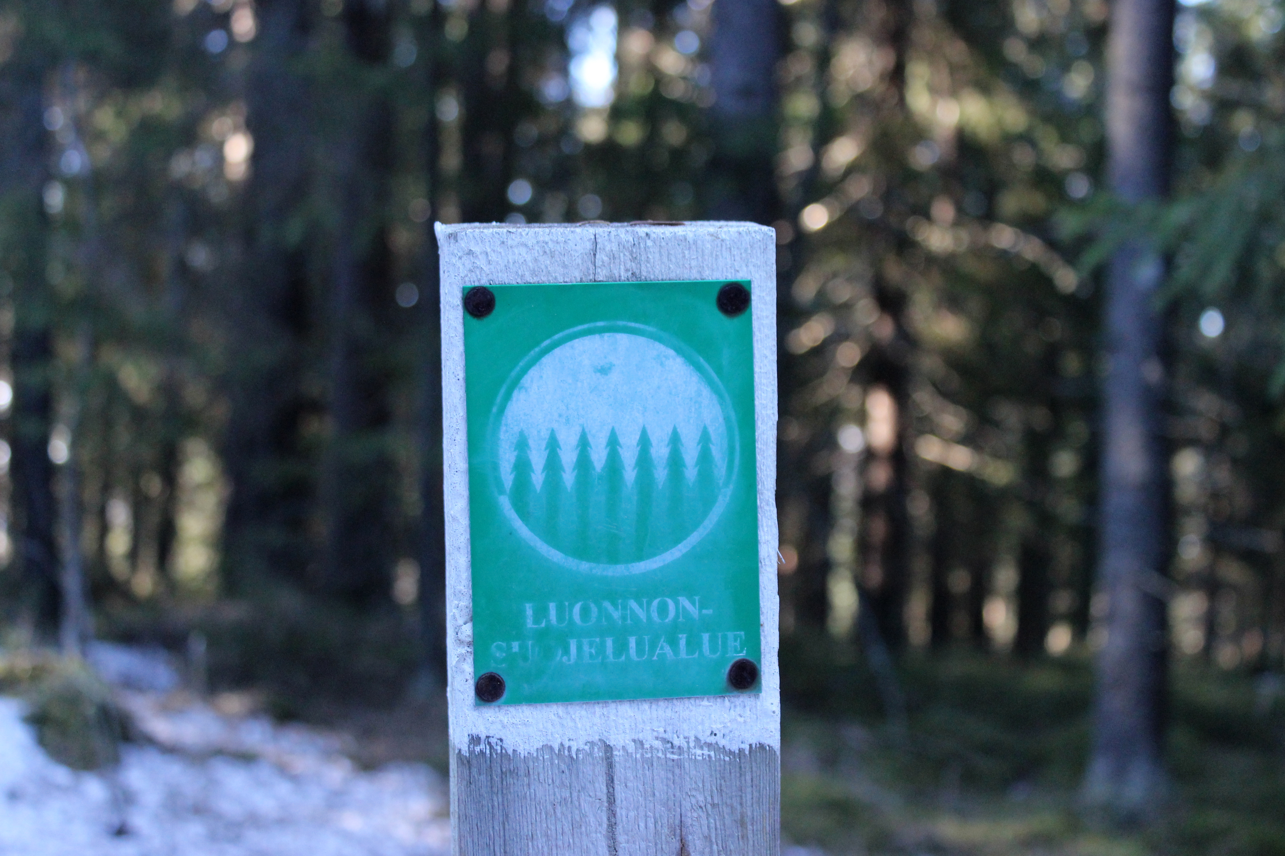 Vanha tienviitalta näyttävä kyltti osoitti metsään päin keskeltä hakkuuaukeaa. Polun kohta erottui pienenä syvennyksenä hangessa. No, polun kohdat vaan erottaa jollain ihmeellä, vaikka lunta päällä onkin. Hanki kantoi hienosti. Aukon reunalla polku kaartoi jyrkästi vasemmalle kulkemaan pitkin metsän ja aukon rajaa. Vähän matkan päästä polku siirtyi vanhaan kuusikkoon kulkemaan, mitään opasteita ei näkynyt.