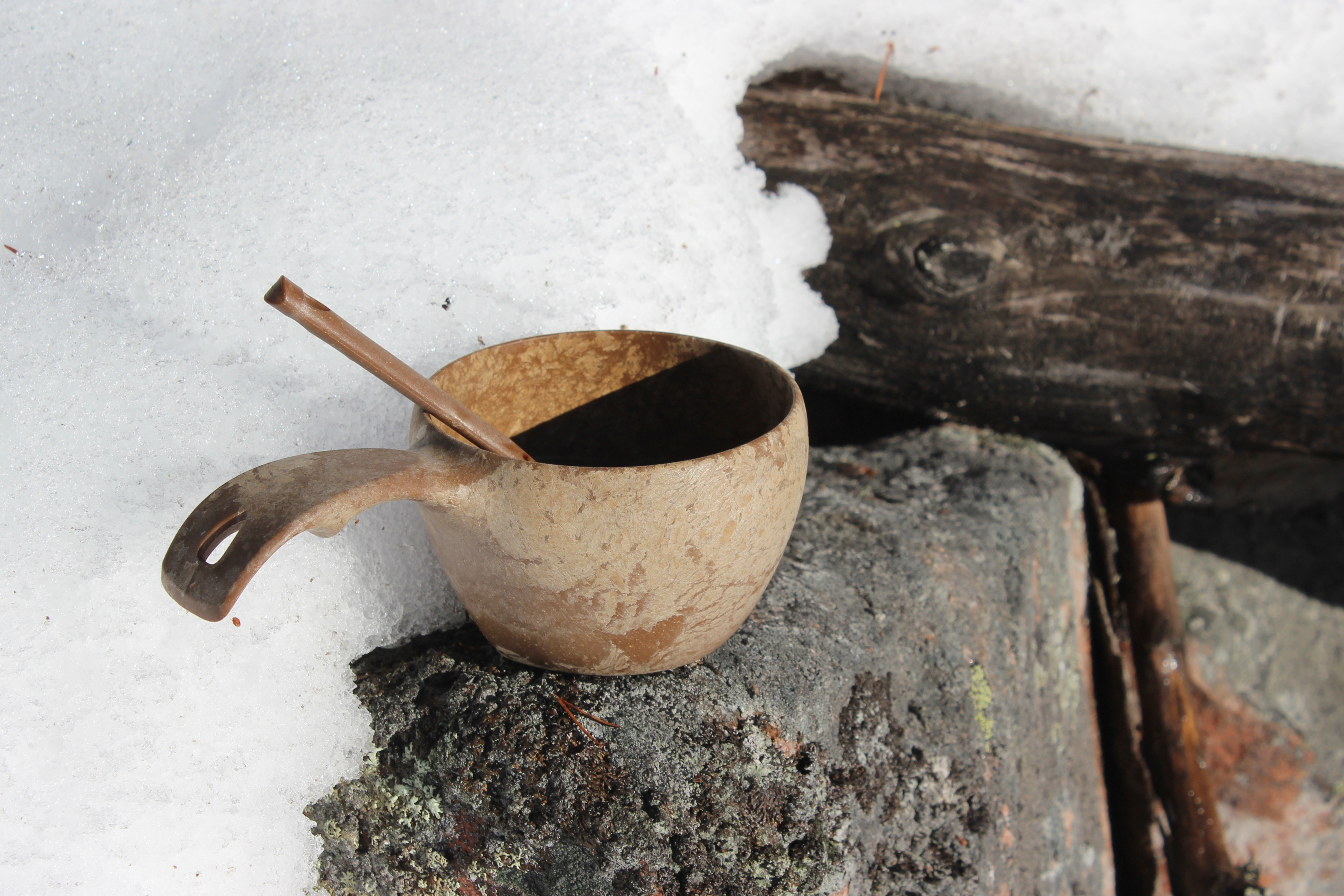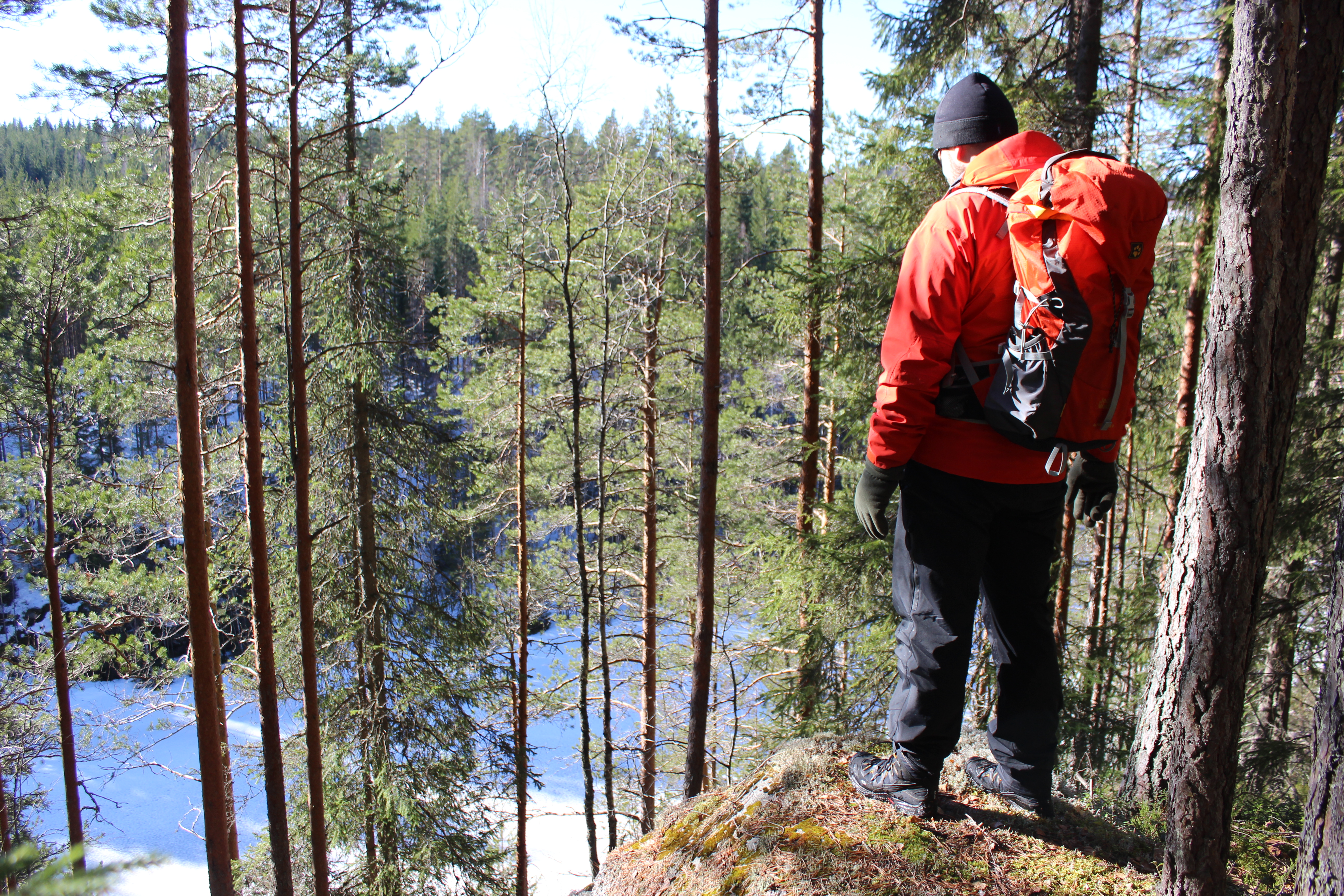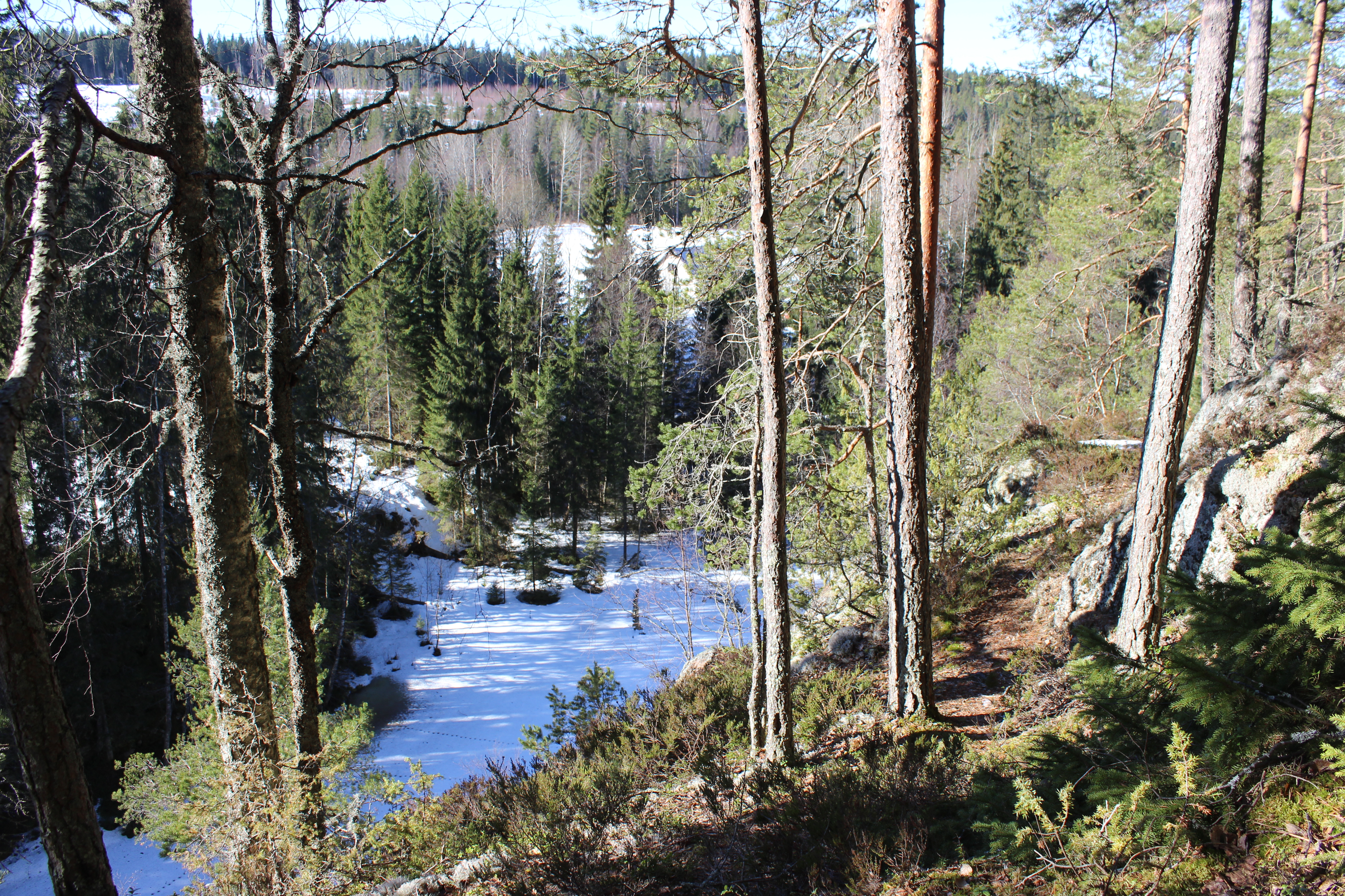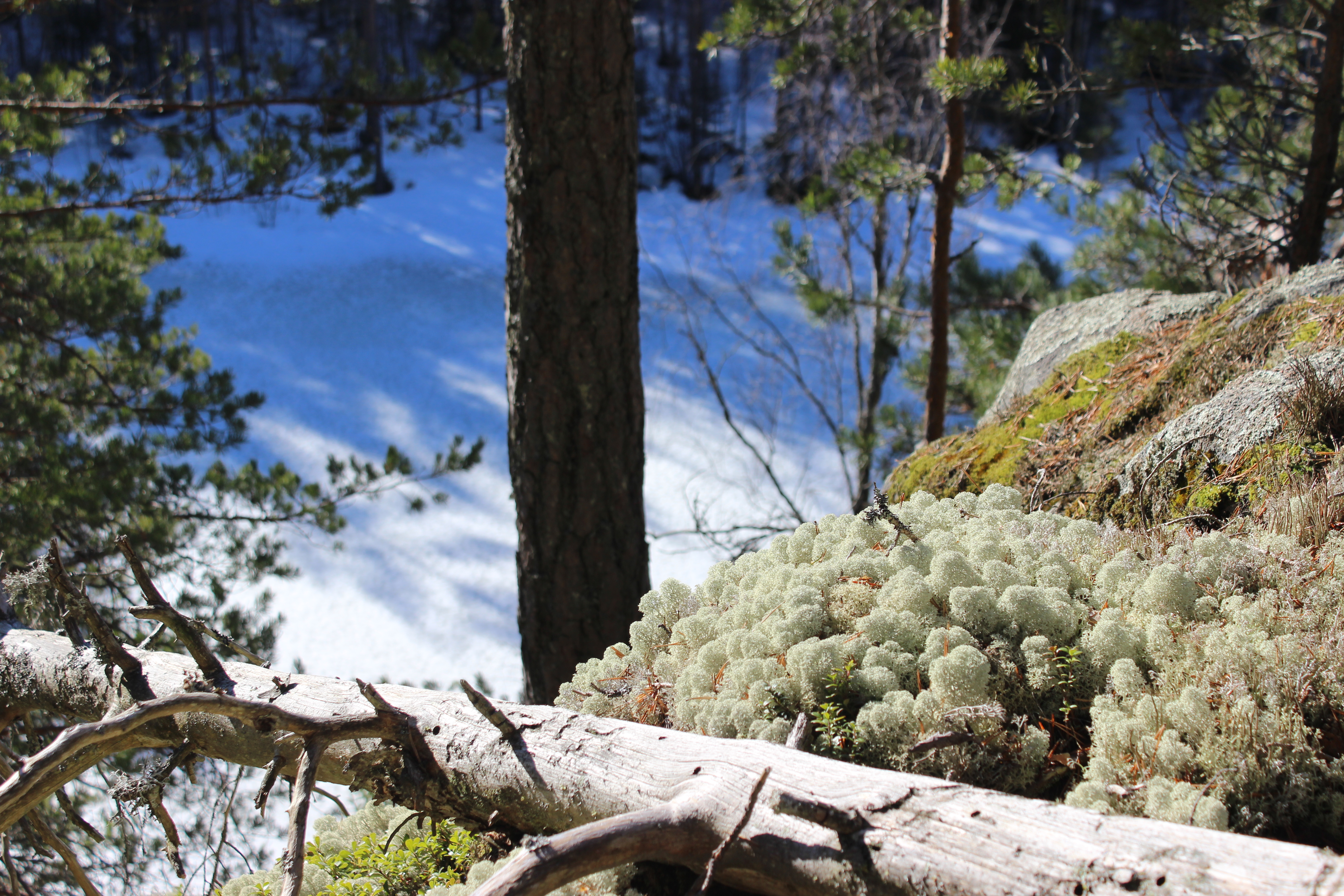 Näköalat oli huikeat! Noin 30 metrin korkeusero järven pinnan ja kallion ylätasanteen välillä pisti jo vähän varovaiseksi osittain jäässä olevalla polulla. Järvi alla näkyi hienosti, vaikka rinteessä kasvaakin vanhoja kilpikaarnaisia mäntyjä. Jäällä oli eläinten jälkiä. Koivuissa oli paljon pahkoja, sellaisia unelmien kuksatarpeita.