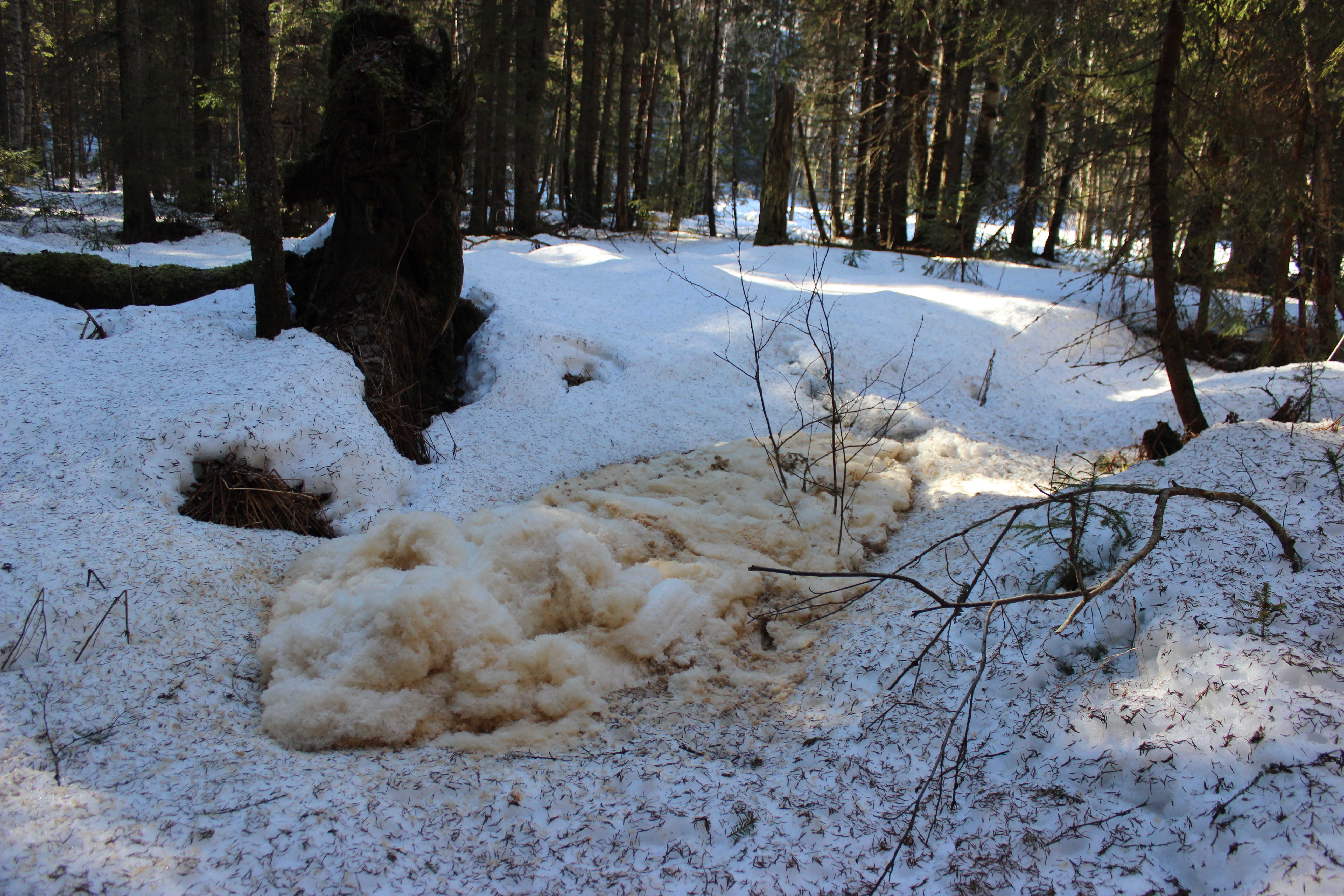Matkaa aikamme taitettuamme polku ”hävisi”. Lumi lisääntyi ja aloimme kuulla rinteen alta kohinaa. Siirryimme rinteen alle. Siellä oli lumen ja jään alla melkoiset luonnonvoimat käynnissä! Siellä täällä oli jää- ja lumikerroksessa aukkoja, joista virtaava vesi näkyi. Moneen paikkaan oli lumen päälle noussut suuria vaahtokekoja virran voimasta. Vesi valui Rotkojärveen, toiselta nimeltään Ruuhijärveen. Jää oli osittain sula. Lähellä puroa oli kivivyörymä, vähän niinkuin pirunpelto rinteessä.