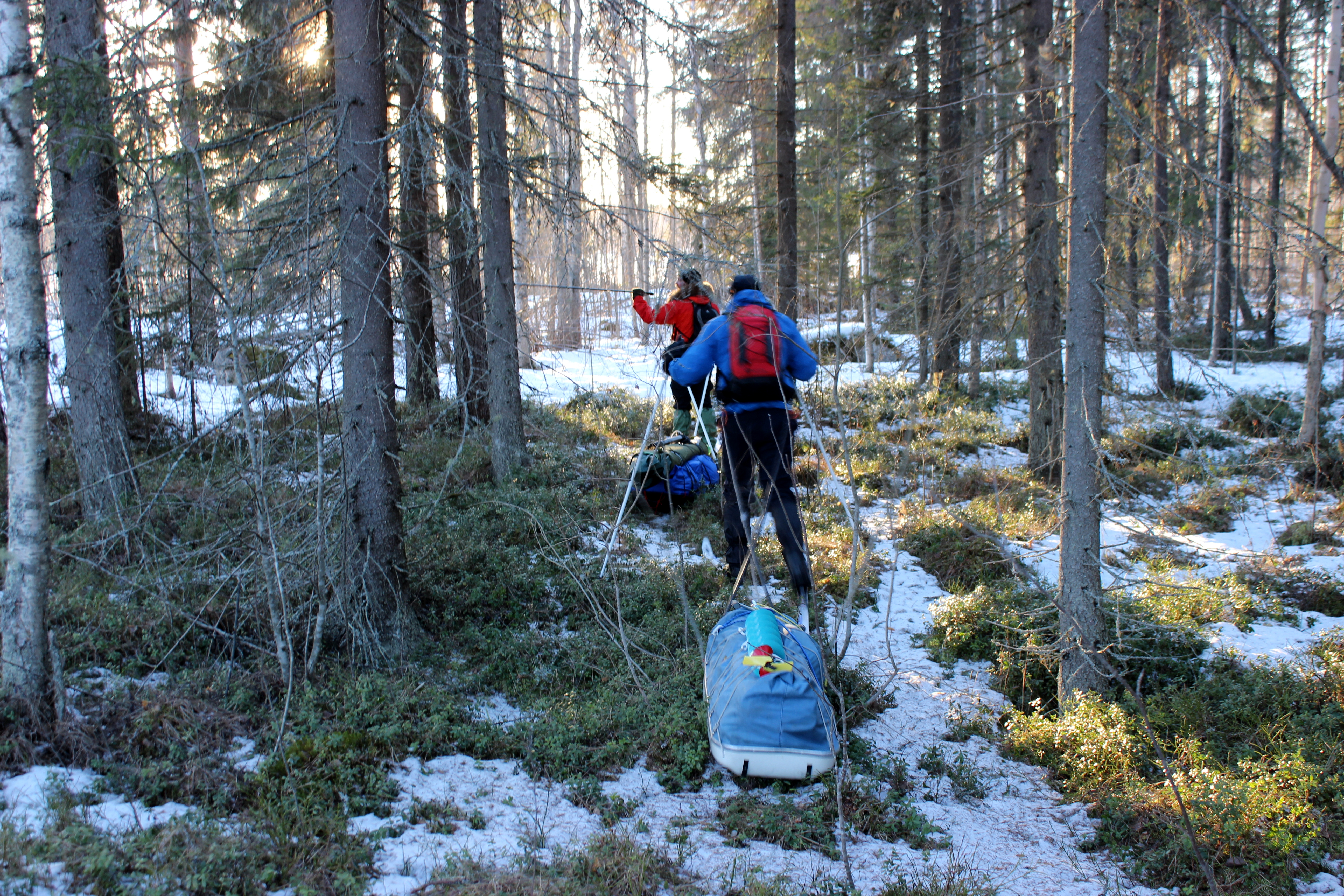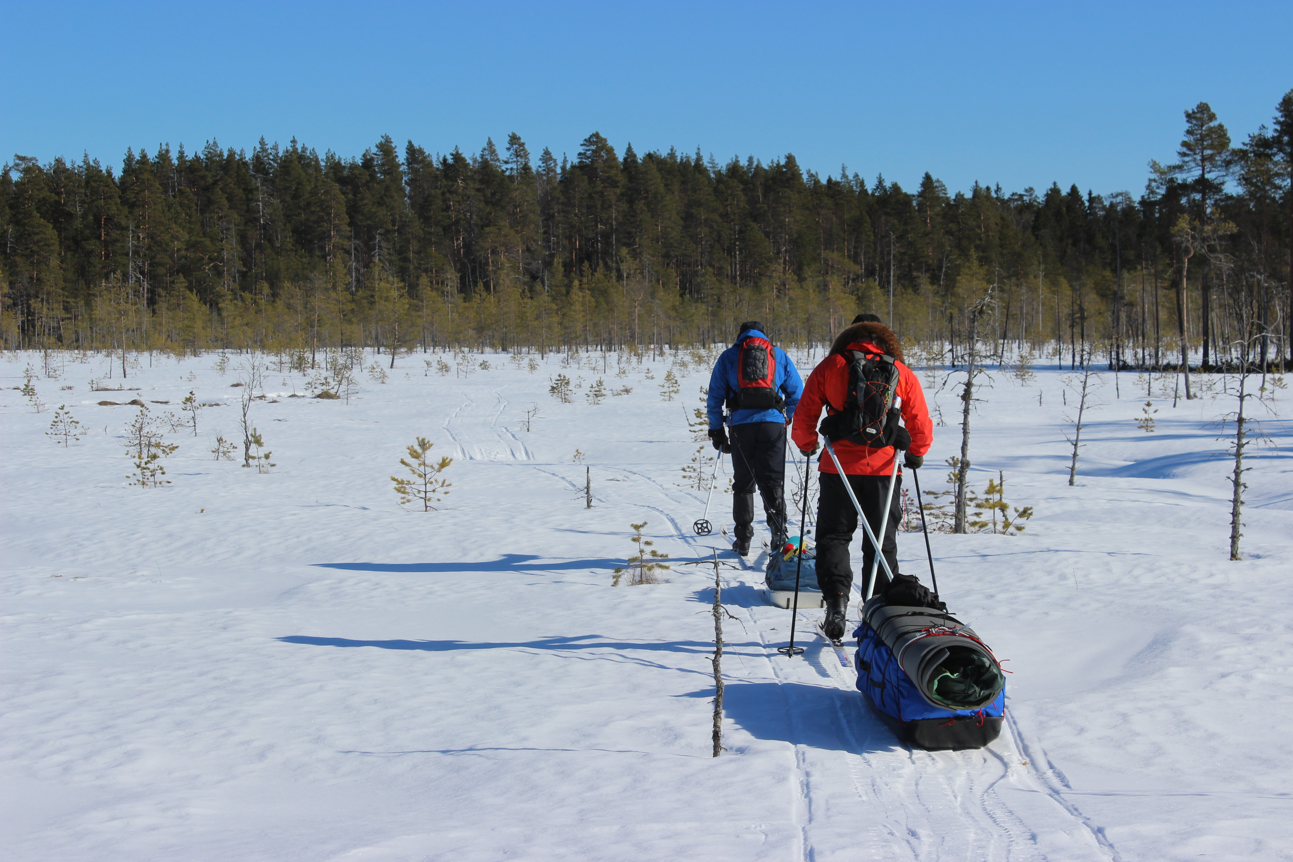 Myös reitin orjallinen noudattaminen päätettiin unohtaa heti kättelyssä. Mentiin sieltä, missä oli hyvin lunta. Suosittiin soita ja järviä. Ratkaisu oli hyvä, koska etelärinteet ja rannat olivat täysin lumettomia.