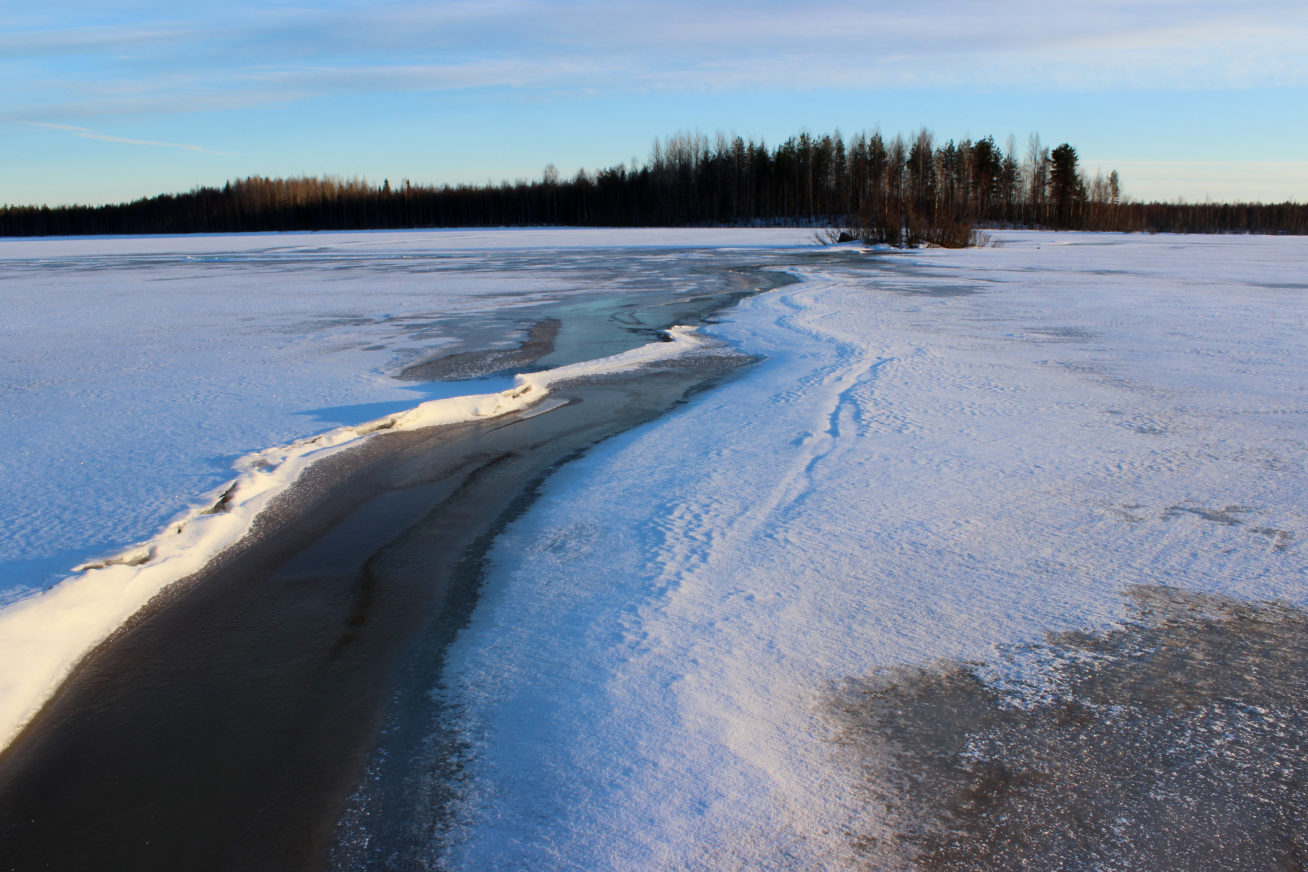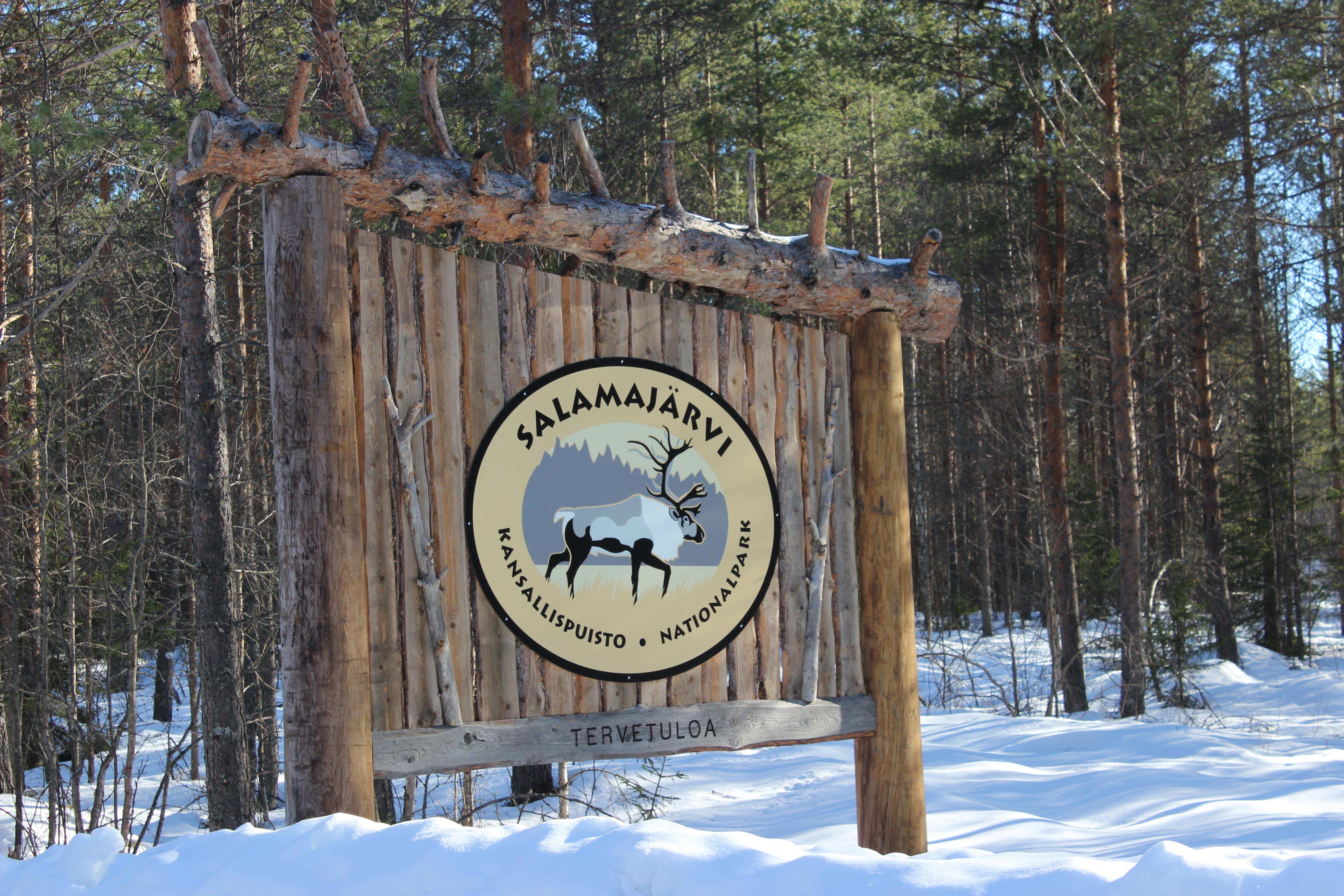 Seuraavana aamuna satoi taas märkää lunta. Suunnattiin soita pitkin Salamajärvelle. Järvi oli kaunis ja karu, ihan kuin joku olisi heittänyt isoja kiviä siihen sikin sokin. Nähtiin maakotka läheltä! Se kaarteli vähän matkan päässä pitkän tovin, ennen kuin hävisi näkyvistä.