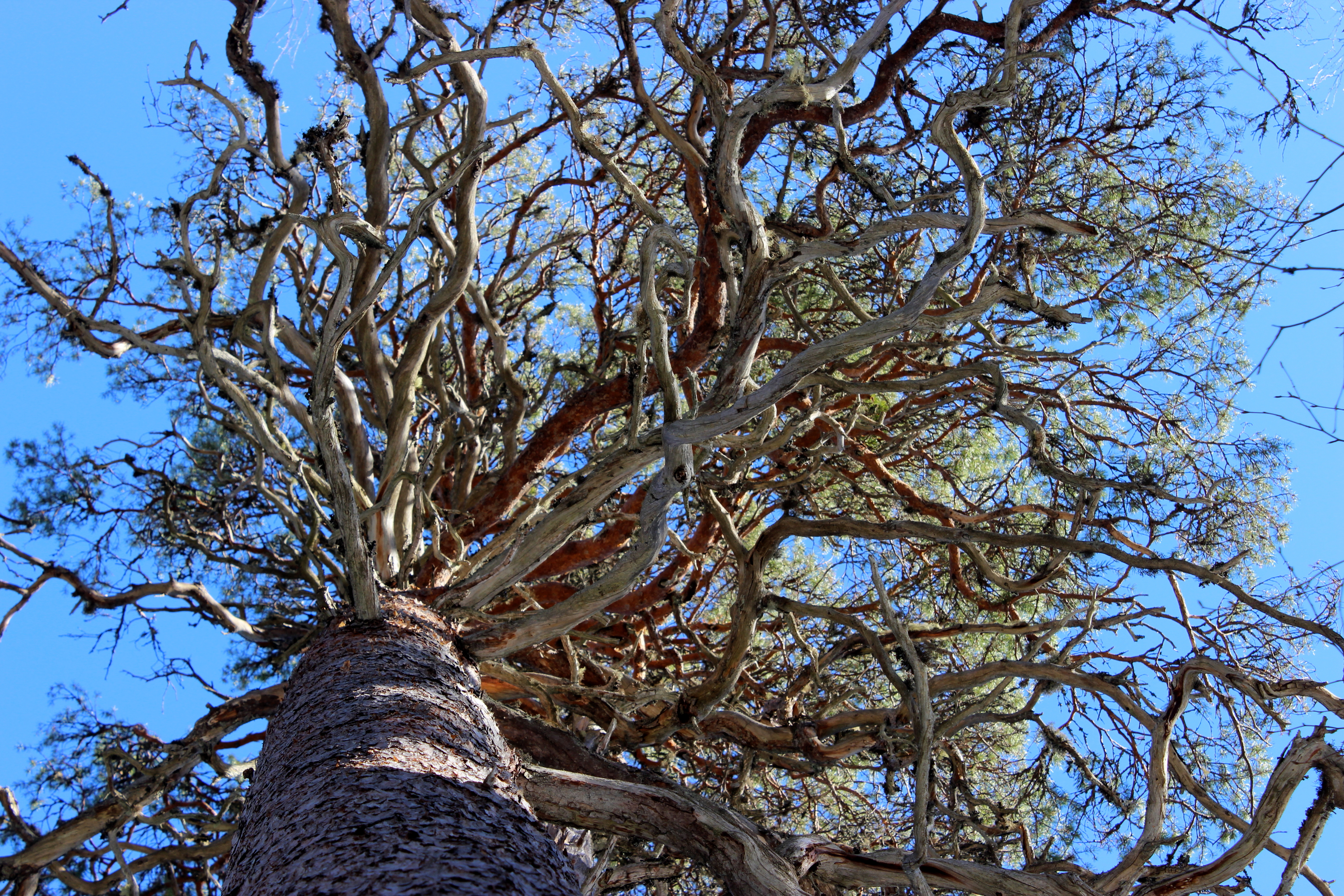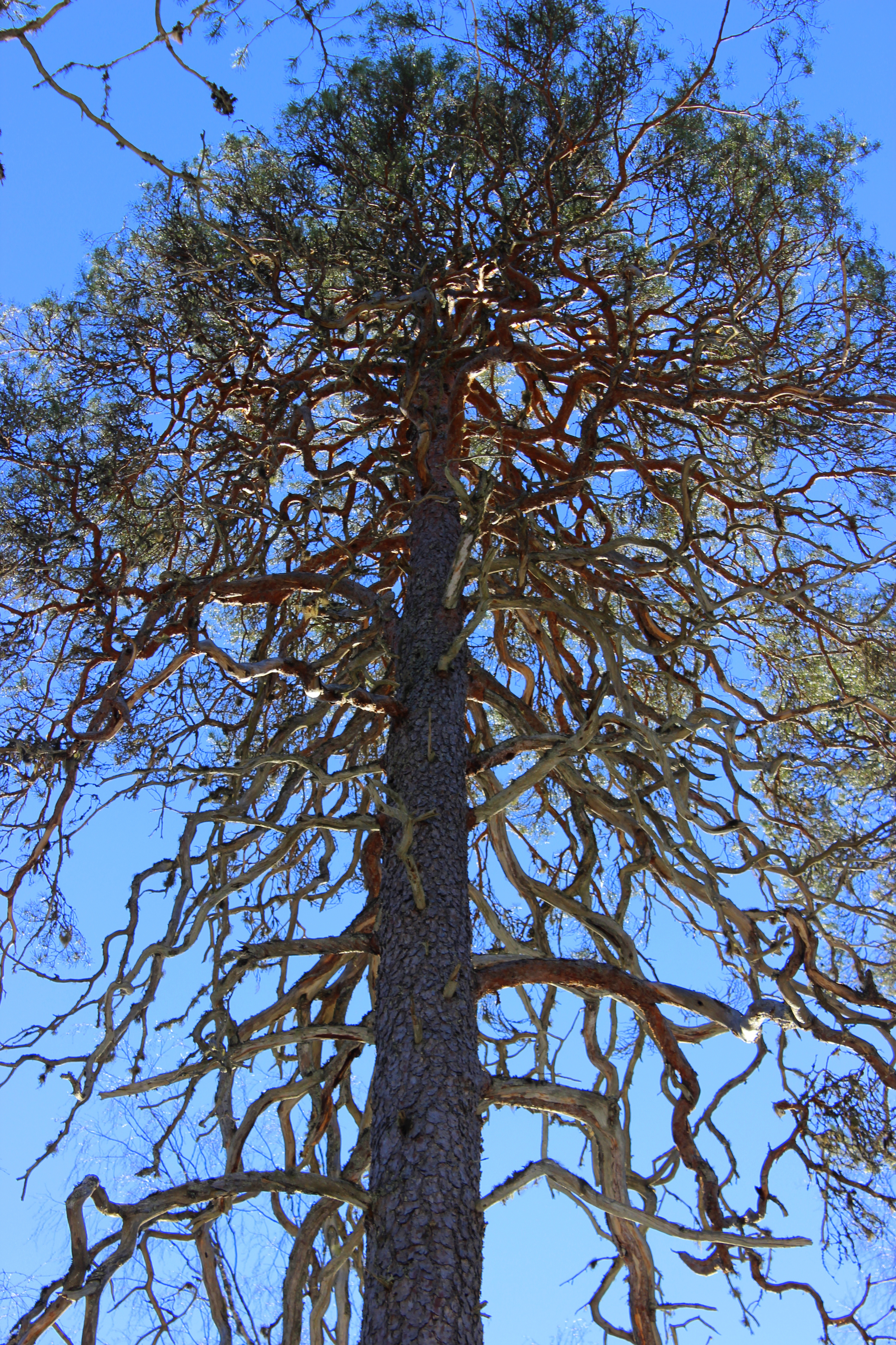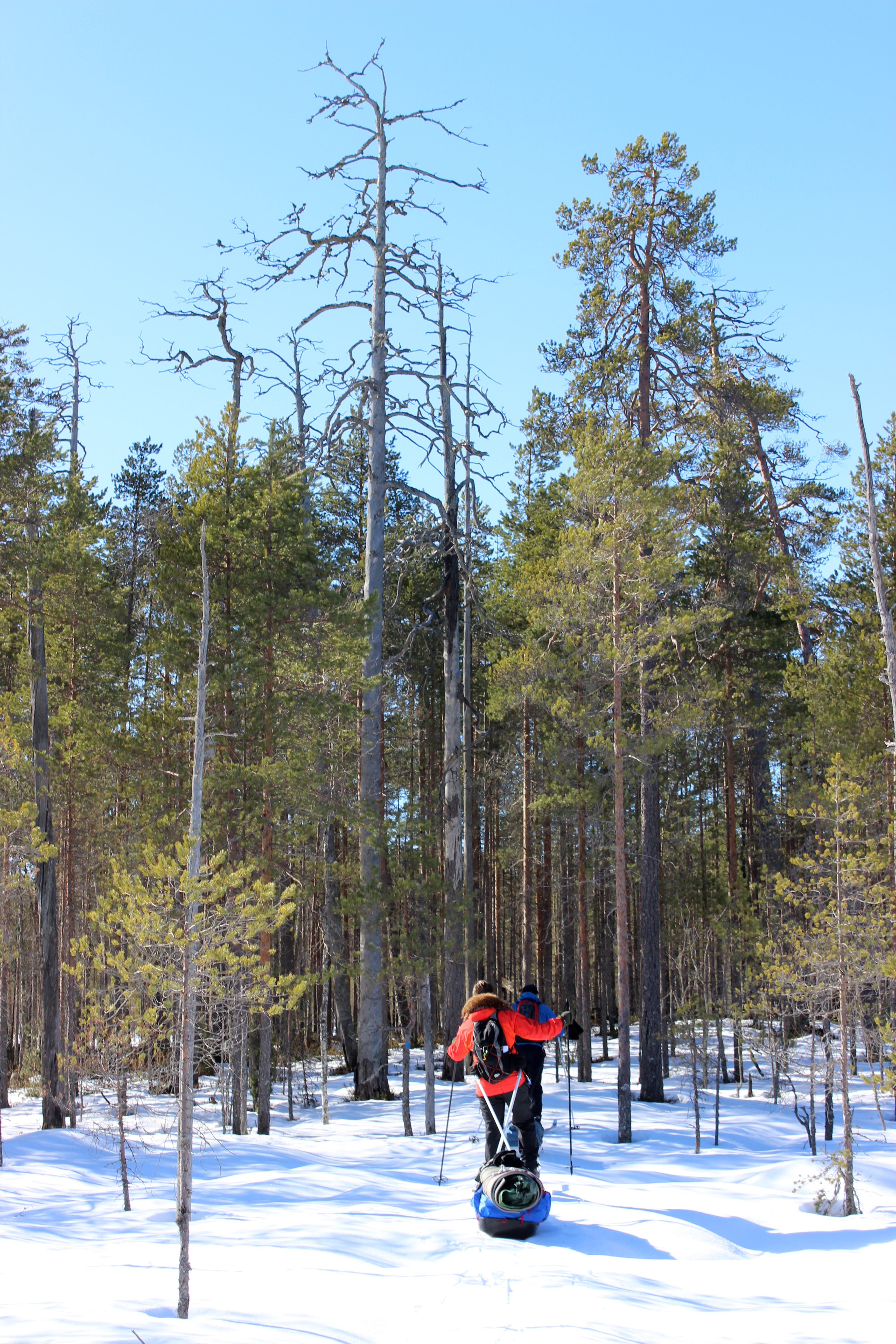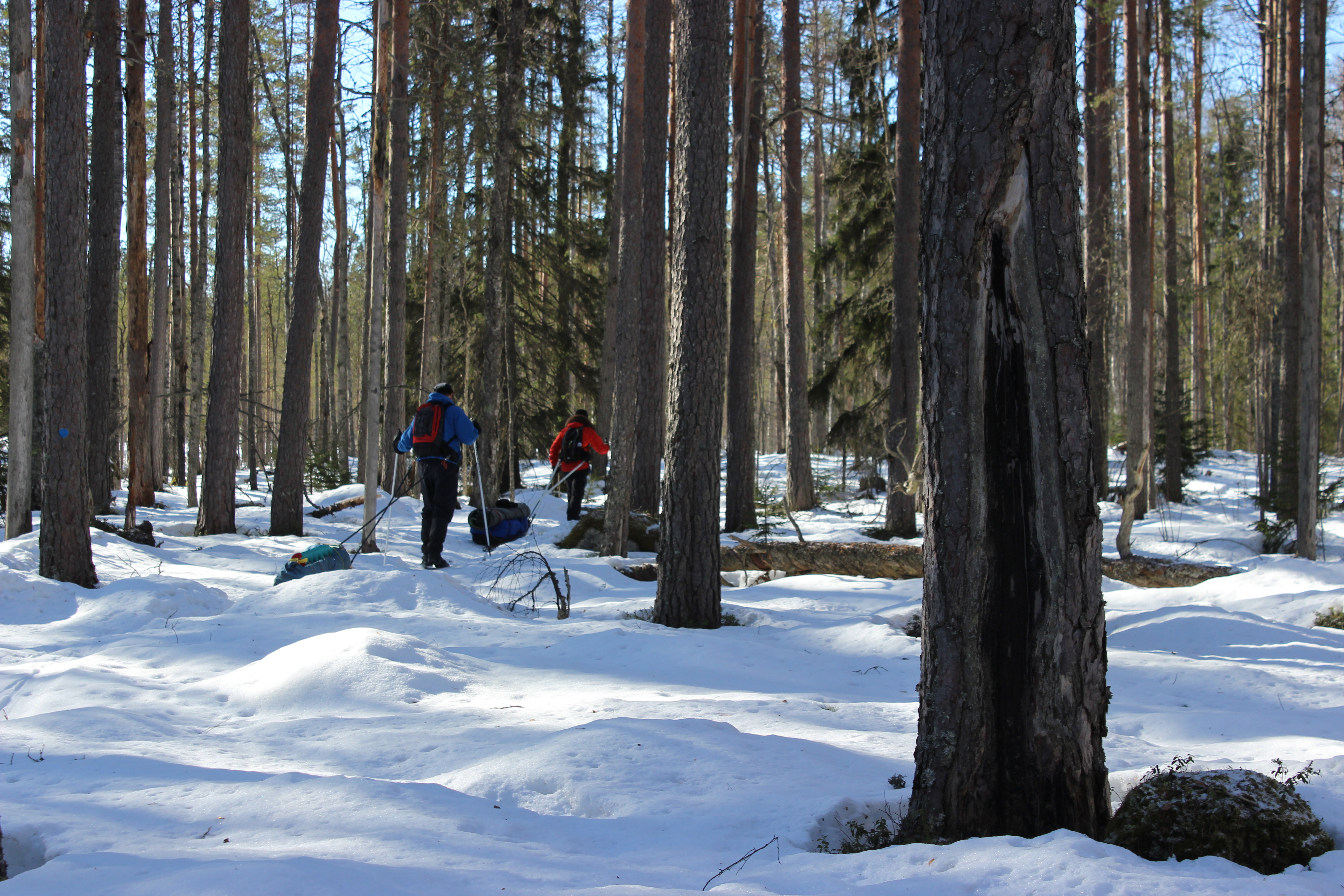 Lumikengistä ja peurojen sorkista syntyneet isot montut oli jäätyneet pakkasessa melkoisiksi monttutaipaleiksi. Rajoitusosalla vanhassa metsässä tien kuoppaisuuden kuitenkin korvasi uskomattoman upeat kilpikaarnaiset männyt. Vanhat metsäpalojen jäljet oli hyvin näkyvissä ja valtavia keloja törötti pystyssä paljon! Muutama vuosi sitten samassa paikassa näin viirupöllöjä. Nyt paikka oli täysin hiljainen. Ei näkynyt eikä kuulunut mitään. Pakkasen kovettamaa hankea vasten sukset ja ahkiot pitivät kyllä niin kovaa ääntä, että metsän eläjät osasivat varmasti kaikota tieltämme jo matkojen päässä. Puita olisin voinut tuijottaa loputtomiin. Mietiskelin miten vanhoja isoimmat käkkyräoksaiset jättiläiset olivat, millaisia ihmisiä on metsässä aikoinaan niiden runkoa vasten nojaillut ja mitä eläimiä puuvanhukset ovat oksillaan suojelleet. Tuntui hyvältä jättäytyä hetkeksi yksin puiden keskelle ihastelemaan luontoa. Moinen jylhä männikkö herättää minussa voimakkaita onnen tunteita.
