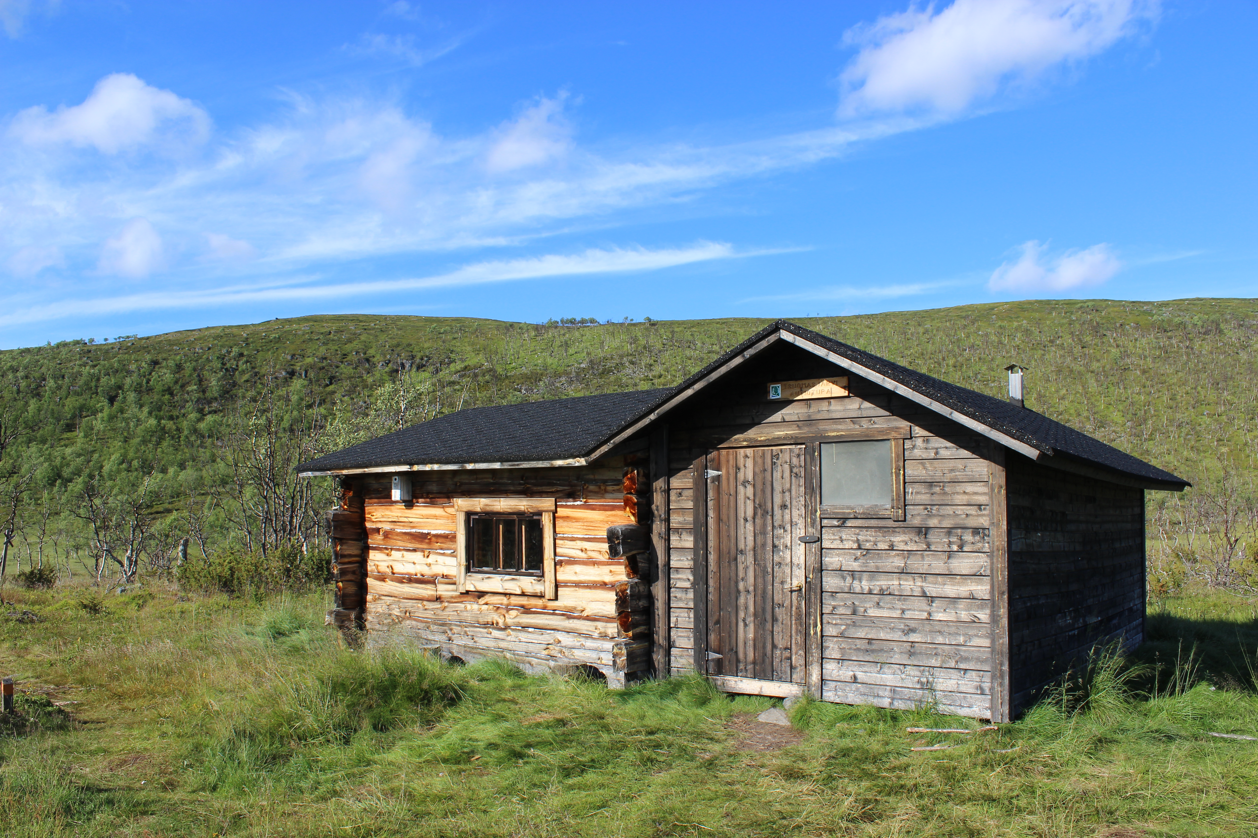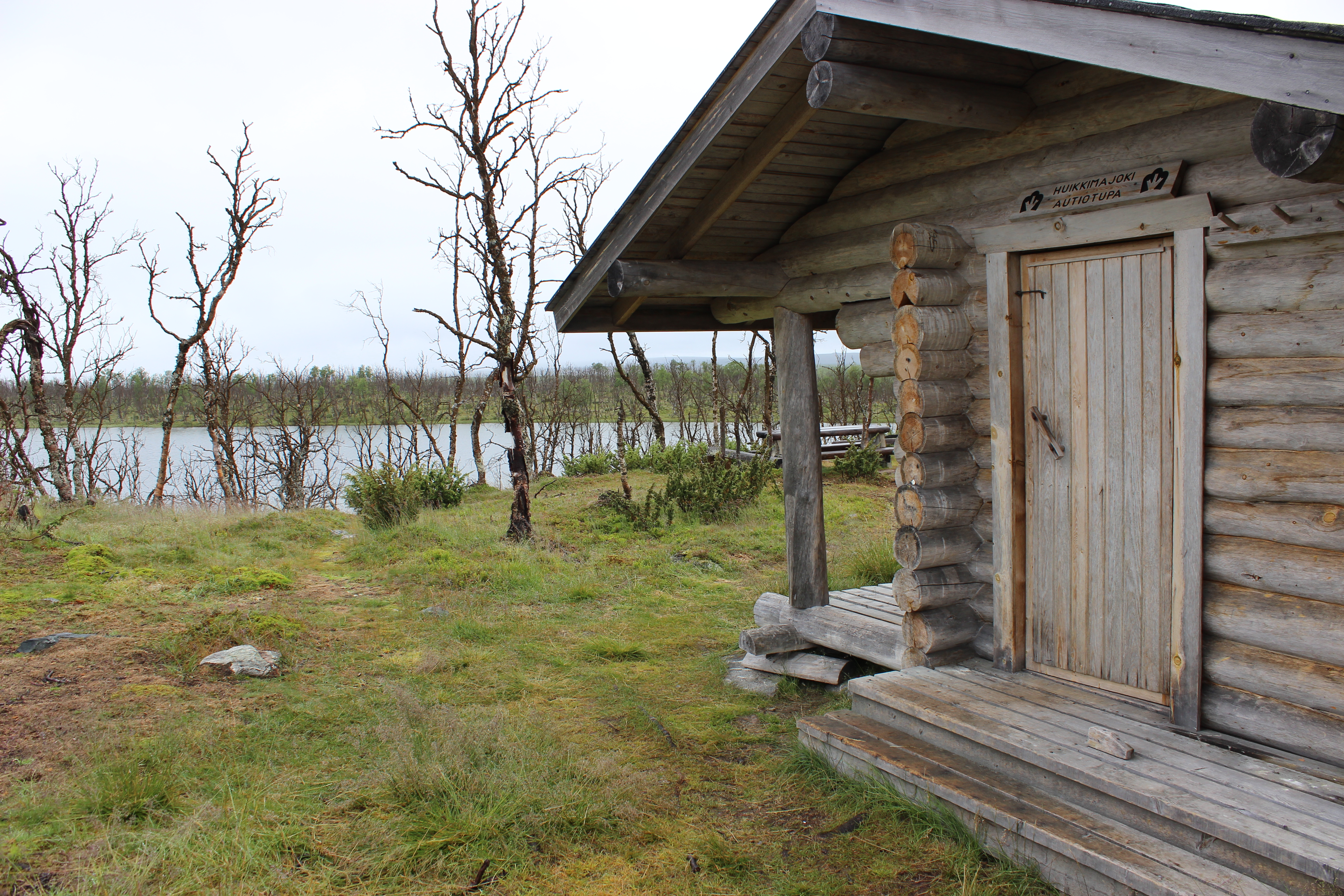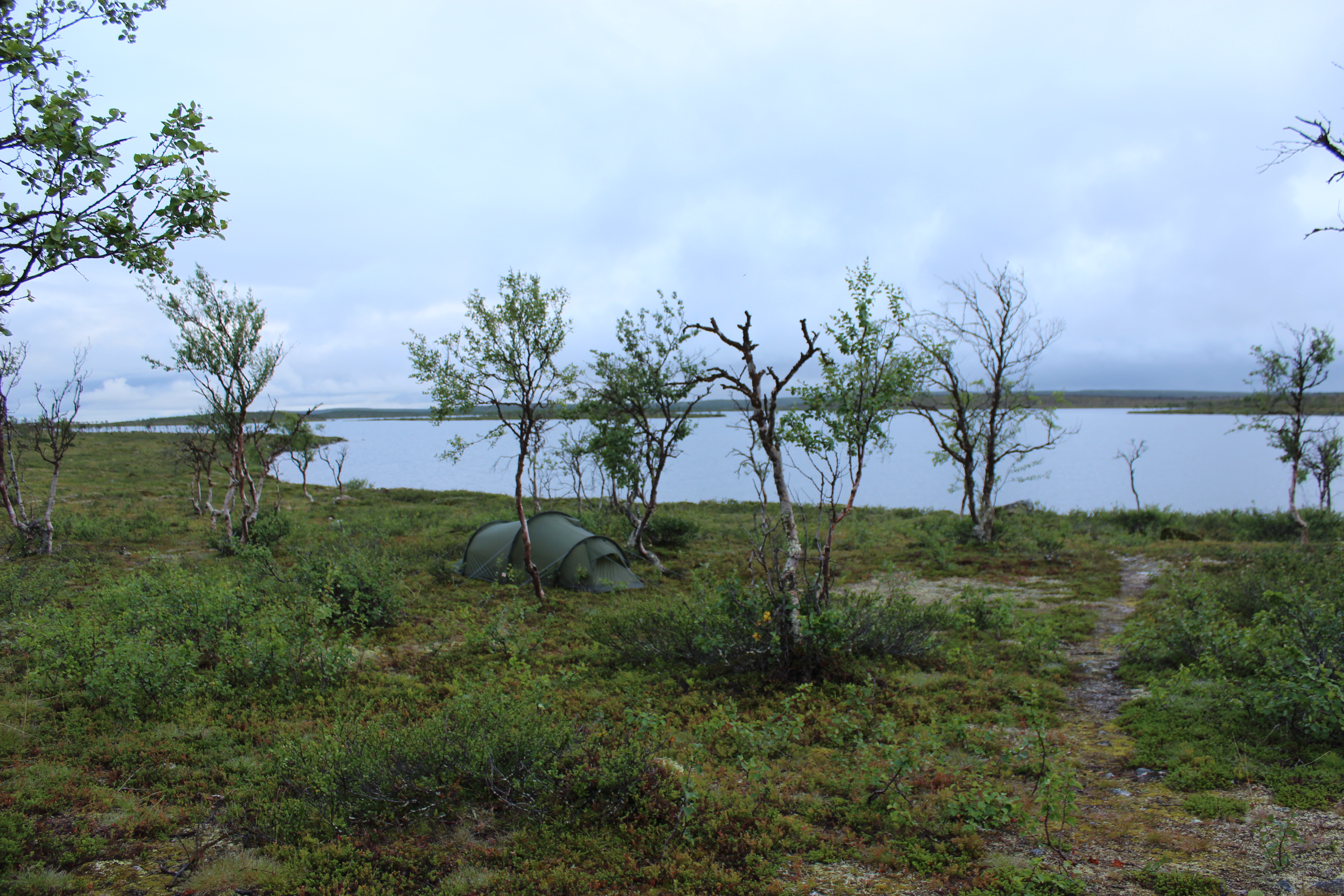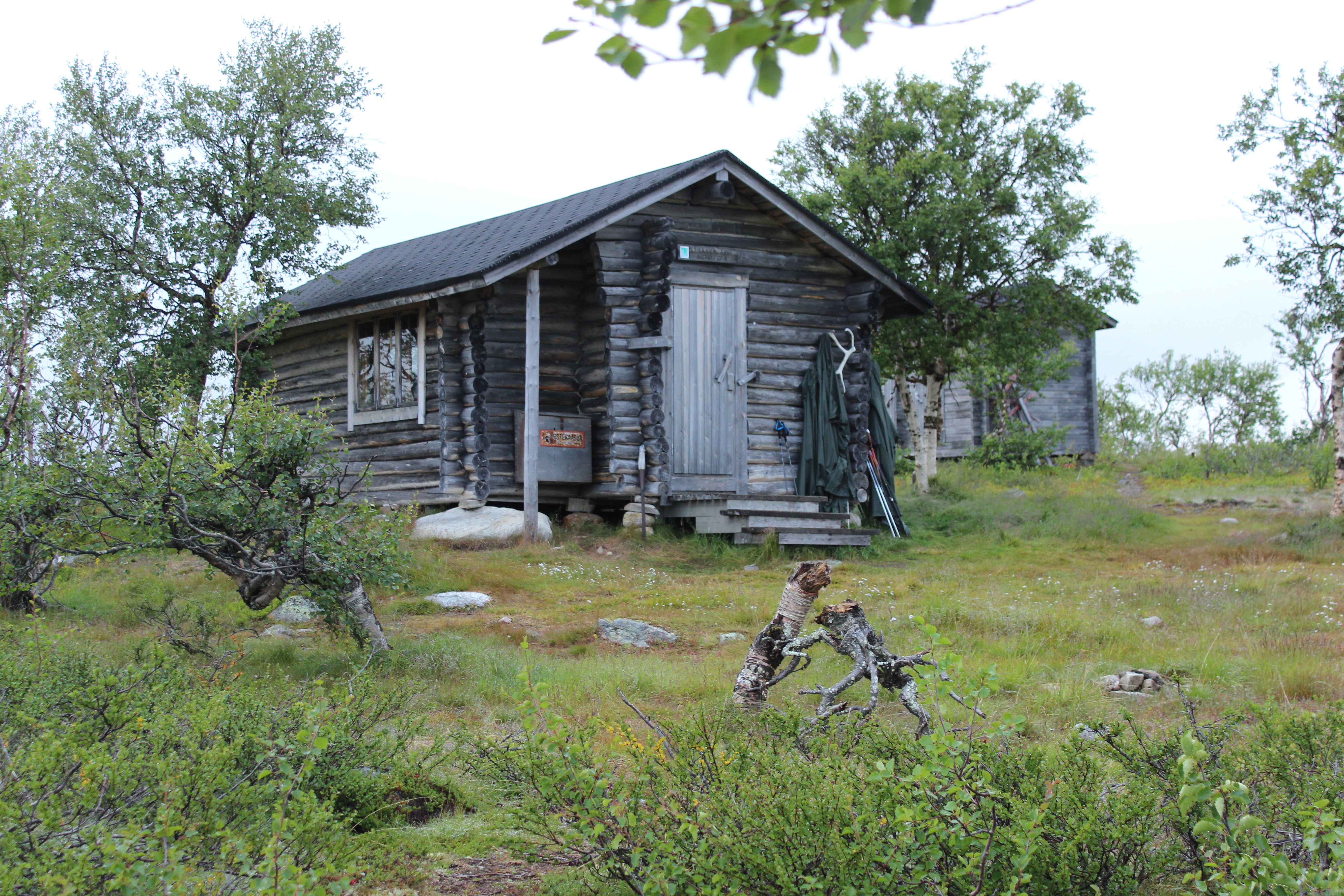 Aamulla heräsin klo 7. Keli oli pilvinen, mutta ei satanut. Teltta oli märkä yön sateista. Keitin kahvia ja mansikkariisipuuroa. Virittelin teltan kahden tunturikoivun väliin tuuleen kuivumaan ja menin sisään tupaan kirjoittamaan vieraskirjaan. Porukka kyseli miten uskallan liikkua yksin ja enkö pelkää karhuja. Sain kuksallisen oikeaa kahvia (itsellä pika). Jätin tupaan yhden pokkarin ja savustuspussin. Lähdin kymmeneltä matkaan. Pohkeisiin ei enää sattunut! Eikä hartioihin. Aloin siis päästä vauhtiin!