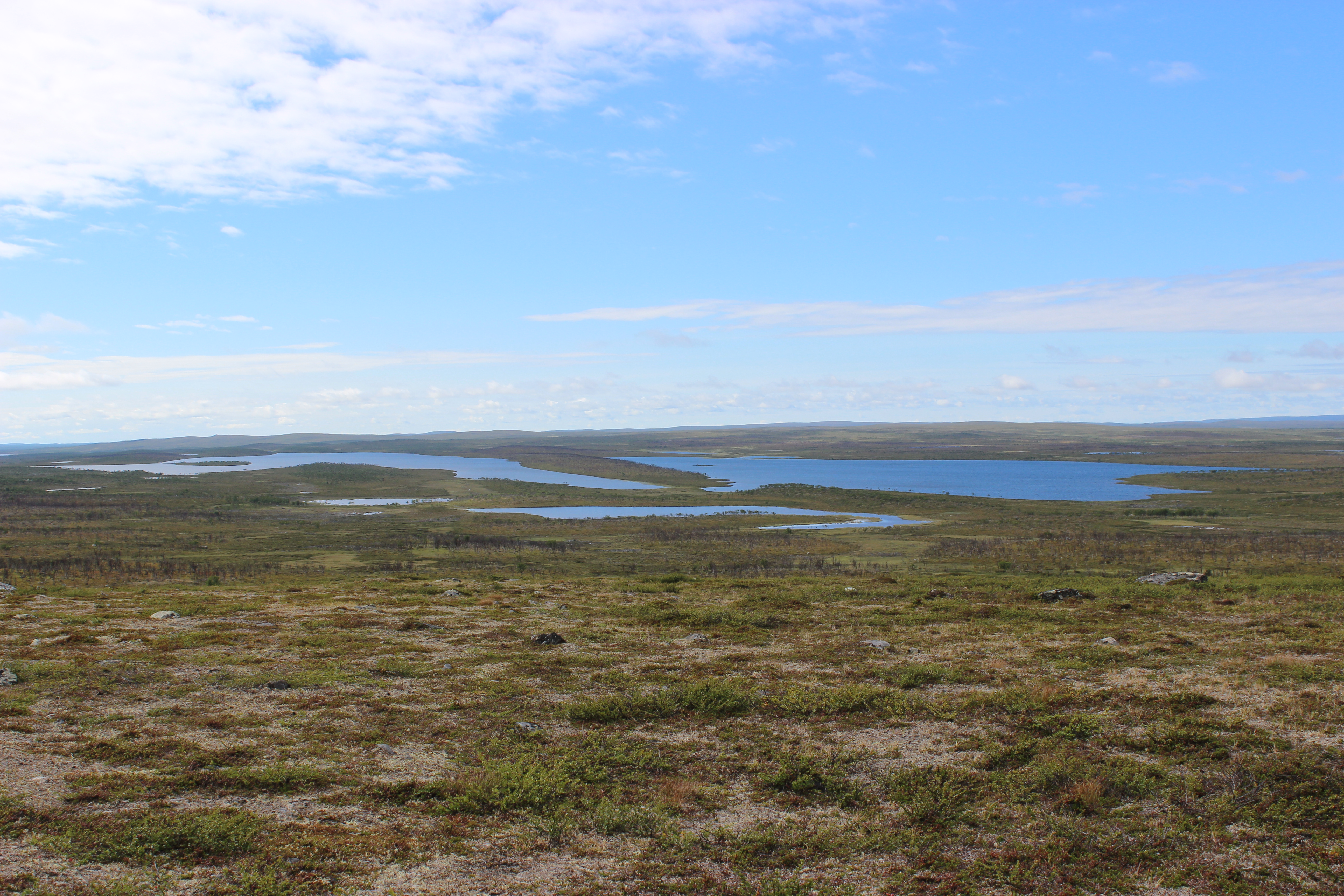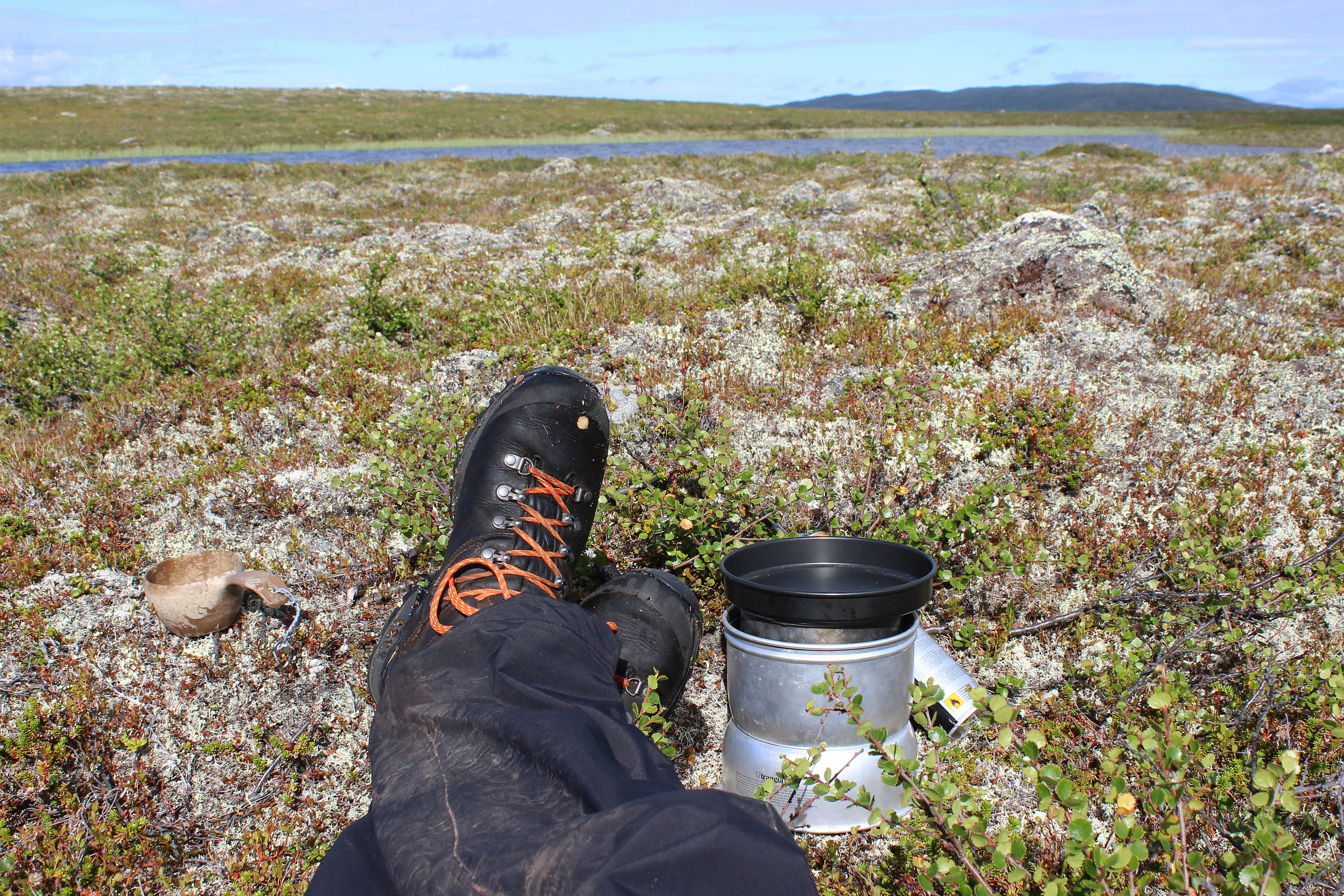 ”Tunturin laelle noustessa keli alkoi kirkastua ja kyllä, aurinko alkoi paistaa! Vihdoinkin!!! Pidin lounastauon puolen päivän jälkeen pienen lammen rannalla, tunturin laelta näkyi Norjan lumihuippuja ja toisella puolella Suomen sileämpimuotoisia tuntureita. Täällä on ihanaa. Otin lounaalla viskiä. Myöhemmin maisemat muuttui ehkä jopa hienommiksi.”