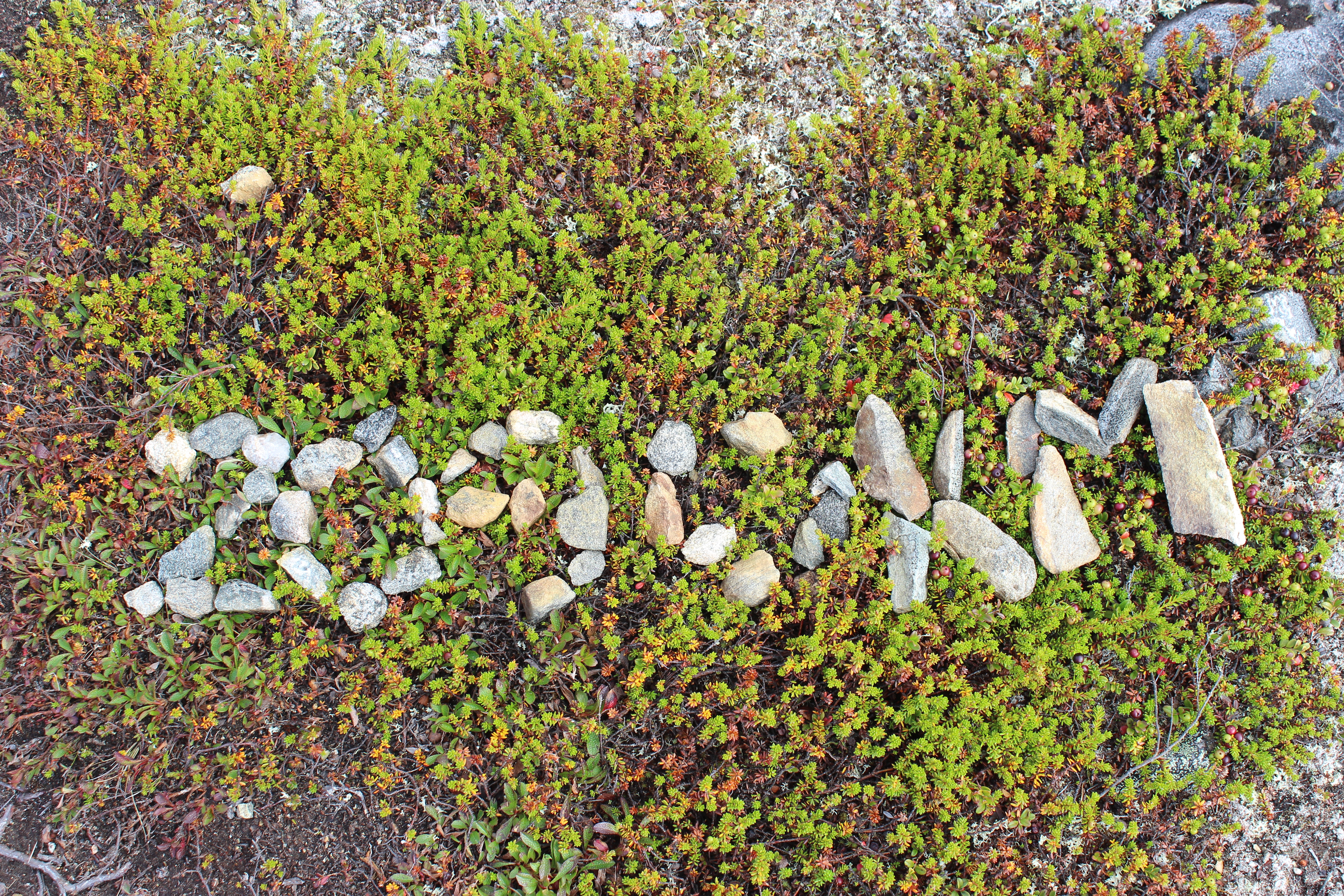 Polku vei ylös tunturin huipulle. Huipulla huomasin maassa pikkukivistä tehdyn tekstin 2090 km. Siis Seikkailu Suomen Ympäri-Tero on ollut täällä! Luin hänen puumerkkinsä jo Huikkimajoen vieraskirjasta.