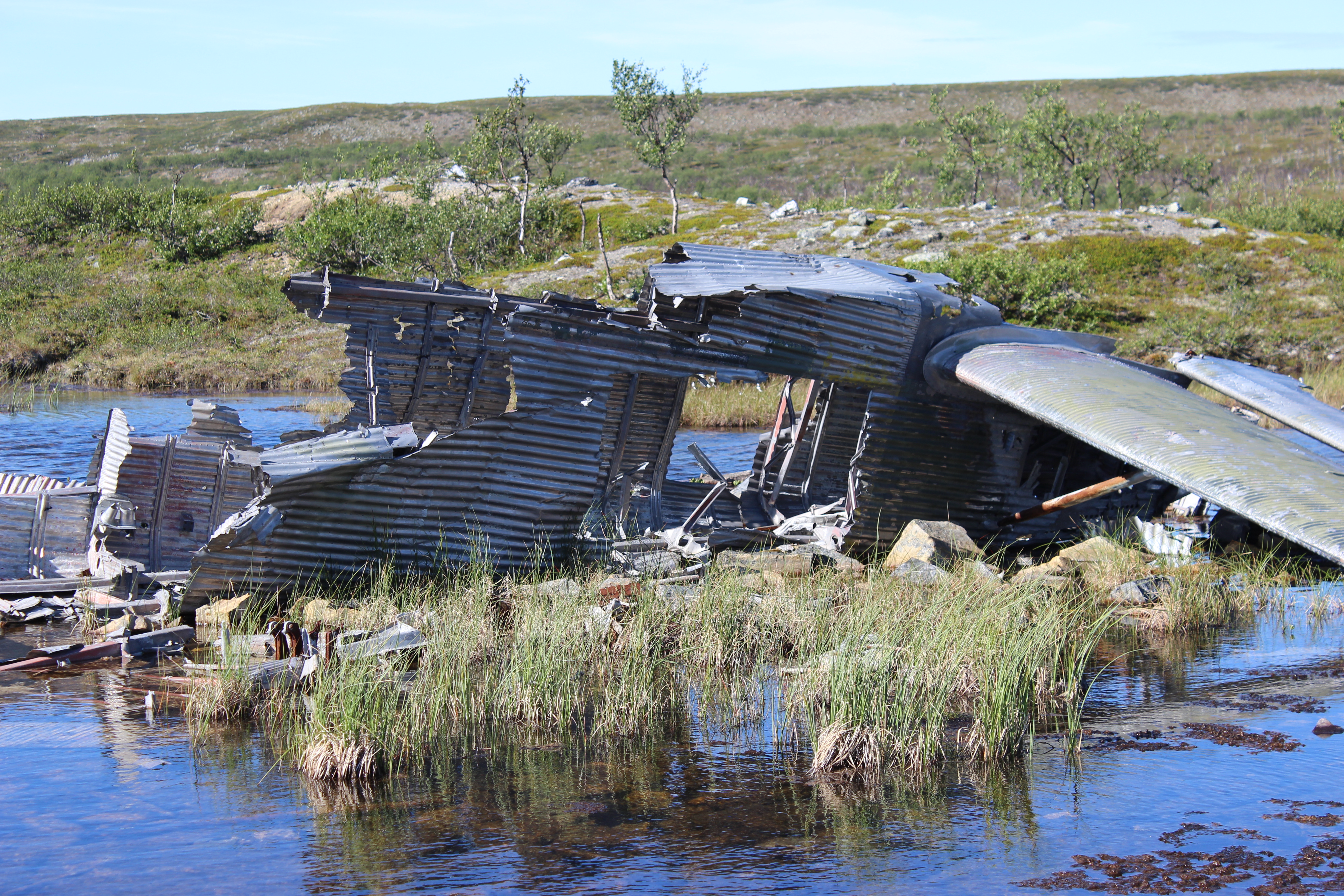 Otin gepsin käyttöön ja pääsin nopeasti hylyn luo. Näky oli aika lohduton. Kuvissa koneen hylky näyttää aika pieneltä, joten sen koko oli minulle yllätys. Pieni lampi peittyi miltei kokonaan lentokoneesta. Alumiinipinta oli haalistunut ajan saatossa, mutta kone oli yllättävän ”kokonainen”.