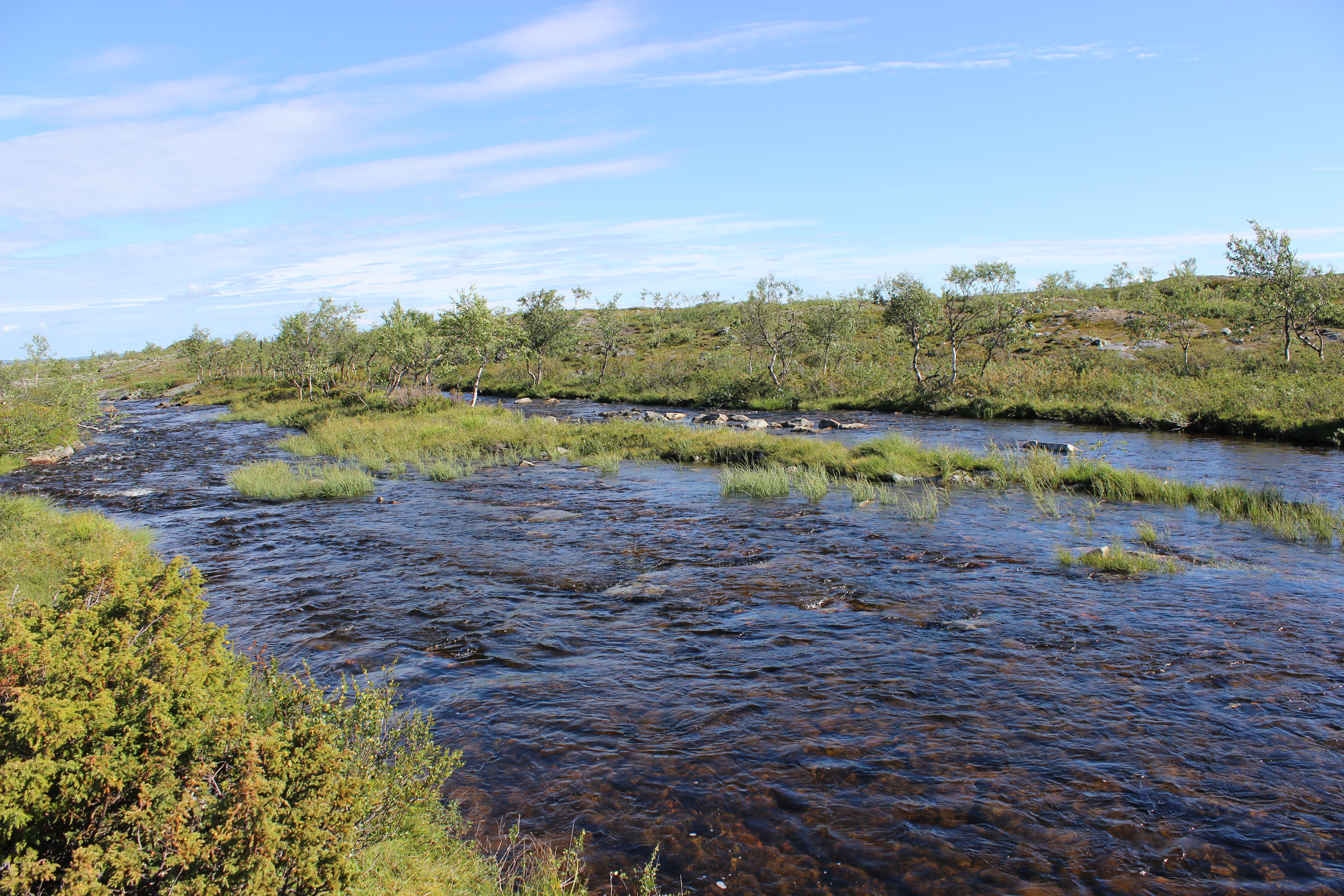 Joki olikin vähän vuolaampi kuin olin kuvitellut kartan perusteella. Seisoskelin hetken joen rannalla ja mietin miten ja mistä menen ylitse. Sitten vastarannalle tuli pariskunta, jotka aikalailla samantien alkoivat riisua kenkiään ja housujaan. He olivat Puolalaisia, ensimmäistä kertaa Suomessa vaeltamassa. Olivat kovin ihastuneita Kaldoaivin erämaahan. Juteltiin tovi pöllöistä, Lapista ja jokien ylittämisestä. He olivat etukäteen soittaneet Metsähallitukselle ja kysyneet kuinka joista mennään yli. Puhelimeen vastannut oli kuulemma ensin sanonut, ettei tiedä kun ei ole koskaan jokia ylittänyt. Myöhemmin oli tullut neuvo, että ylitys on turvallisinta siitä, missä virtaa pienimmällä voimalla.