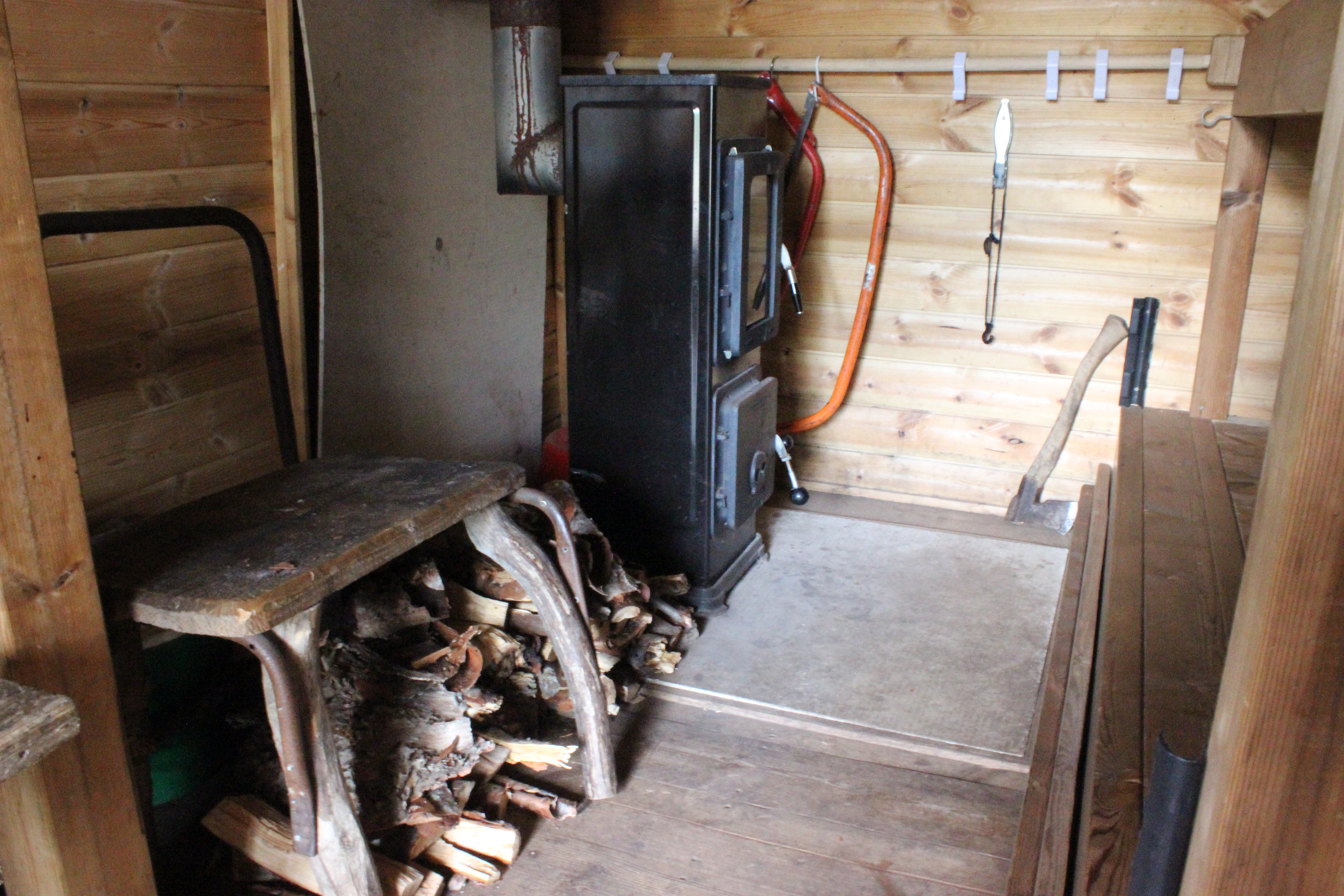 Keli lämpeni koko ajan. Palasin kammin pihalle. Vaeltajasta ei näkynyt vieläkään mitään, ruokapussi roikkui edelleen oven ulkopuolella katossa hiiriä paossa. Olin syömässä lounasta, kun hän heräsi. Hän näytti minulle kartasta fiksumman reitin palata maastopyöräreitille. Jäin valokuvaamaan kammia sisältä, kun hän lähti jatkamaan matkaa.