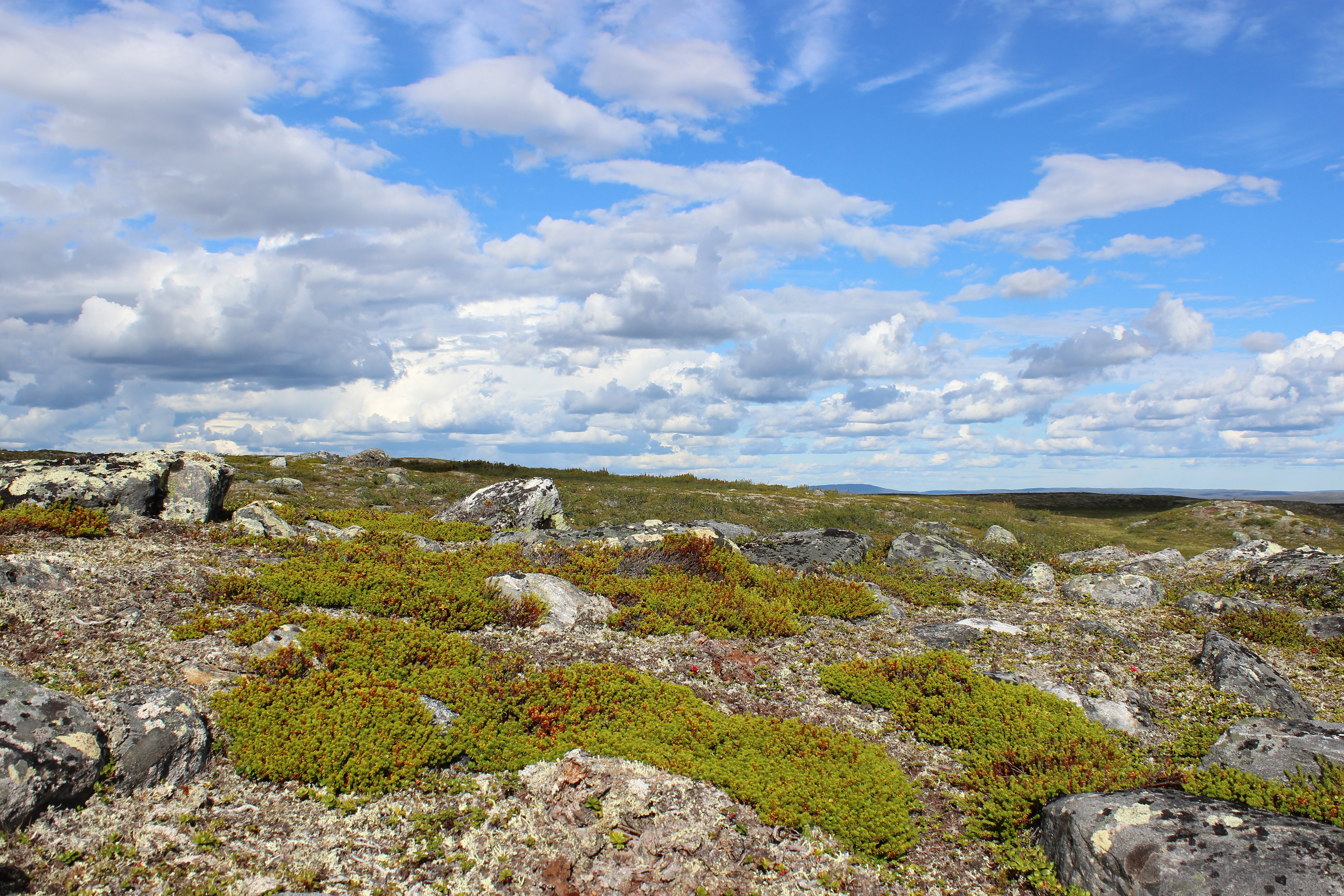 Aamulla matka jatkui kohti Vetsijokea ja Vaisjoen kammia. Tulin kumpareiselle suolle, joka oikein loisti keltaoranssina hilloista! Etenin suon poikki kumpareelta toiselle loikkien ja kumarruin aina noukkimaan hilloja suuhun. Keksin sen olevan lappalaisten crossfittiä: painava rinkka selkään, sauvat käteen, osittain upottava ja epätasainen maasto plus kumarrus poimimaan joka toiselta mättäältä hilla suuhun. Hikistä hommaa se ainakin oli!!!