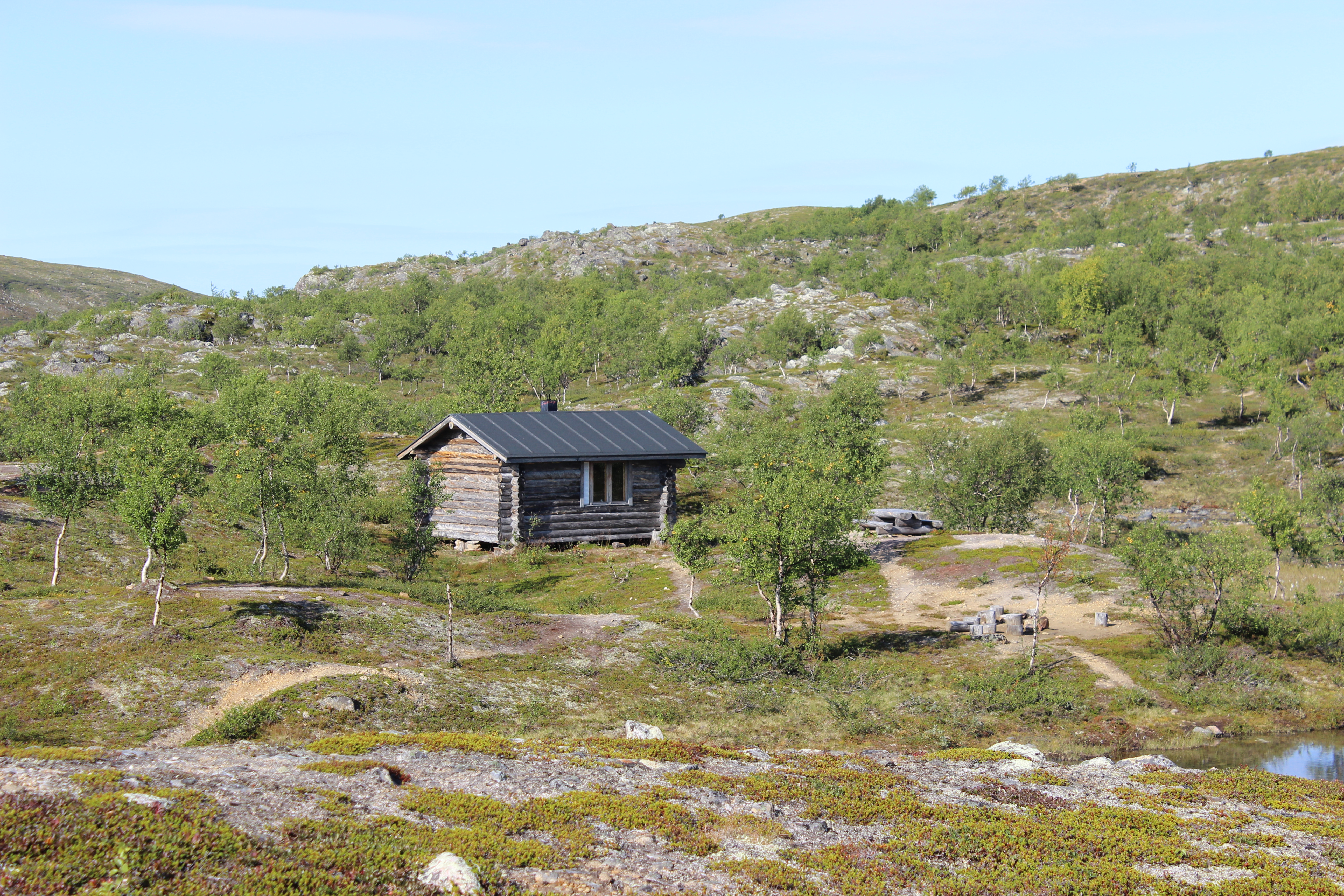 Aamulla annoin naisten puuhastella rauhassa aamutouhunsa, makoilin itse laverilla untuvapussi peittonani. He jatkoivat kohti Utsjokea ja kerroin heillä olevan upeita maisemia edessään. Pihalla hyvästeltiin ja otettiin valokuvia, menin sitten hetkeksi nauttimaan hiljaisesta tuvasta. Purin kaikki ruuat laverille eri kasoihin (välipalat, aamupalat, lounaat, illalliset) ja järjestelin ne rinkkaan fiksummin. Harkitsin välipäivän pitämistä, mutta en malttanut. Päivä oli liian kaunis moiseen. Pitkitin lähtöä kuitenkin iltapäivään, mittarissa pojotti +25 varjossa ja se tuntui aika hikiseltä rinkankantokeliltä tuulettomilla tuntureilla. Siivosin mökin huolella ja lähdin matkaan. Päätin edetä mielummin lyhyen matkan päivässä. Jalkaa vihloi yhä enemmän, joten en halunnut kasata etenemisen suhteen paineita.