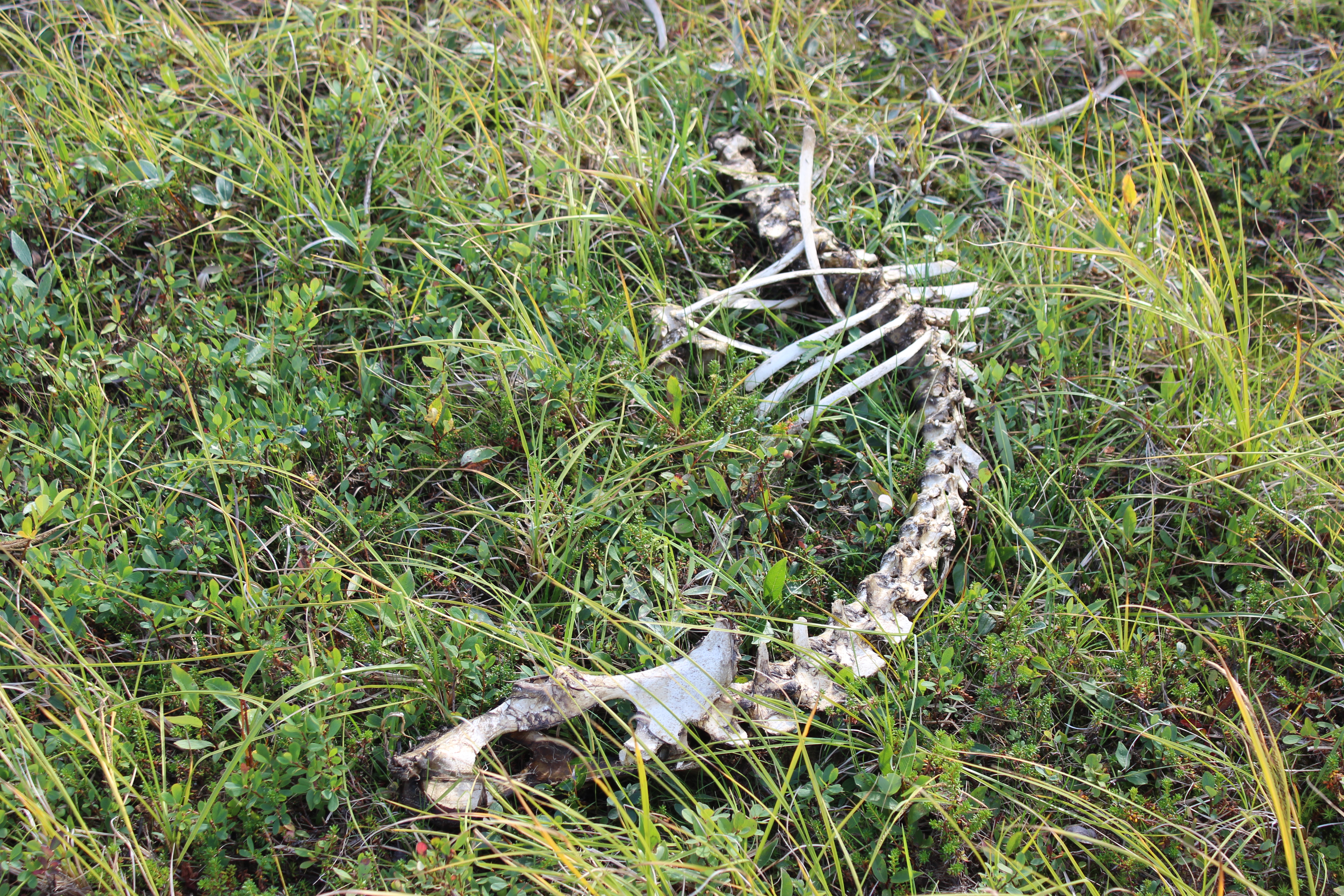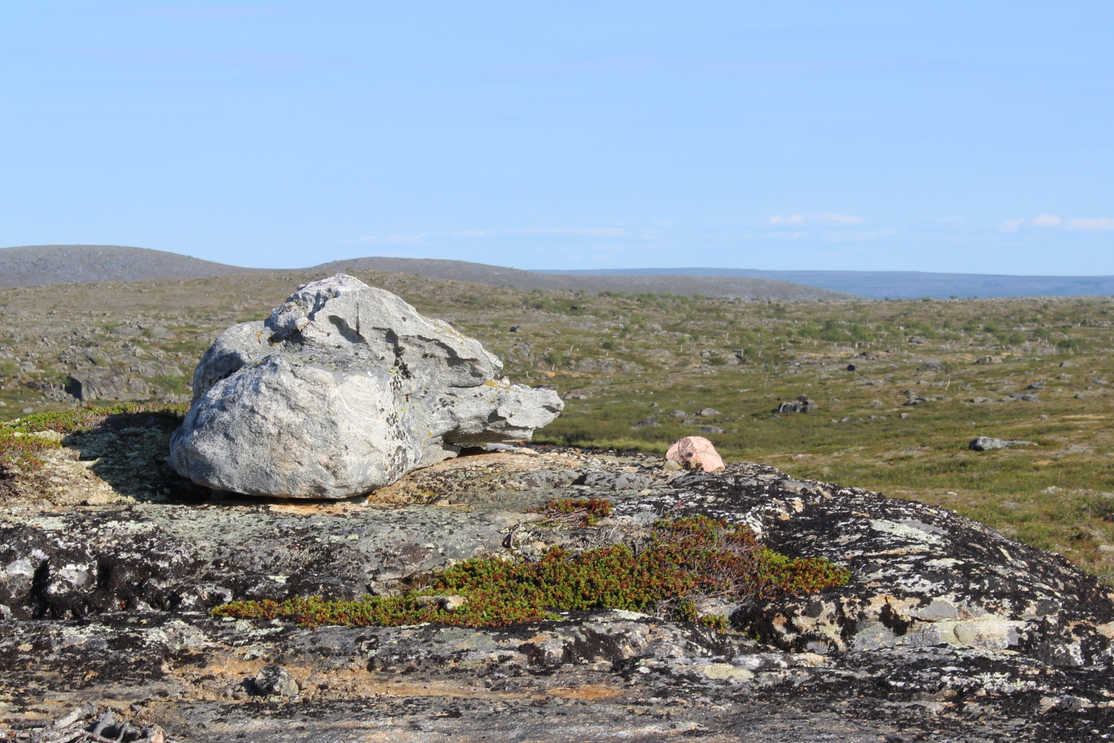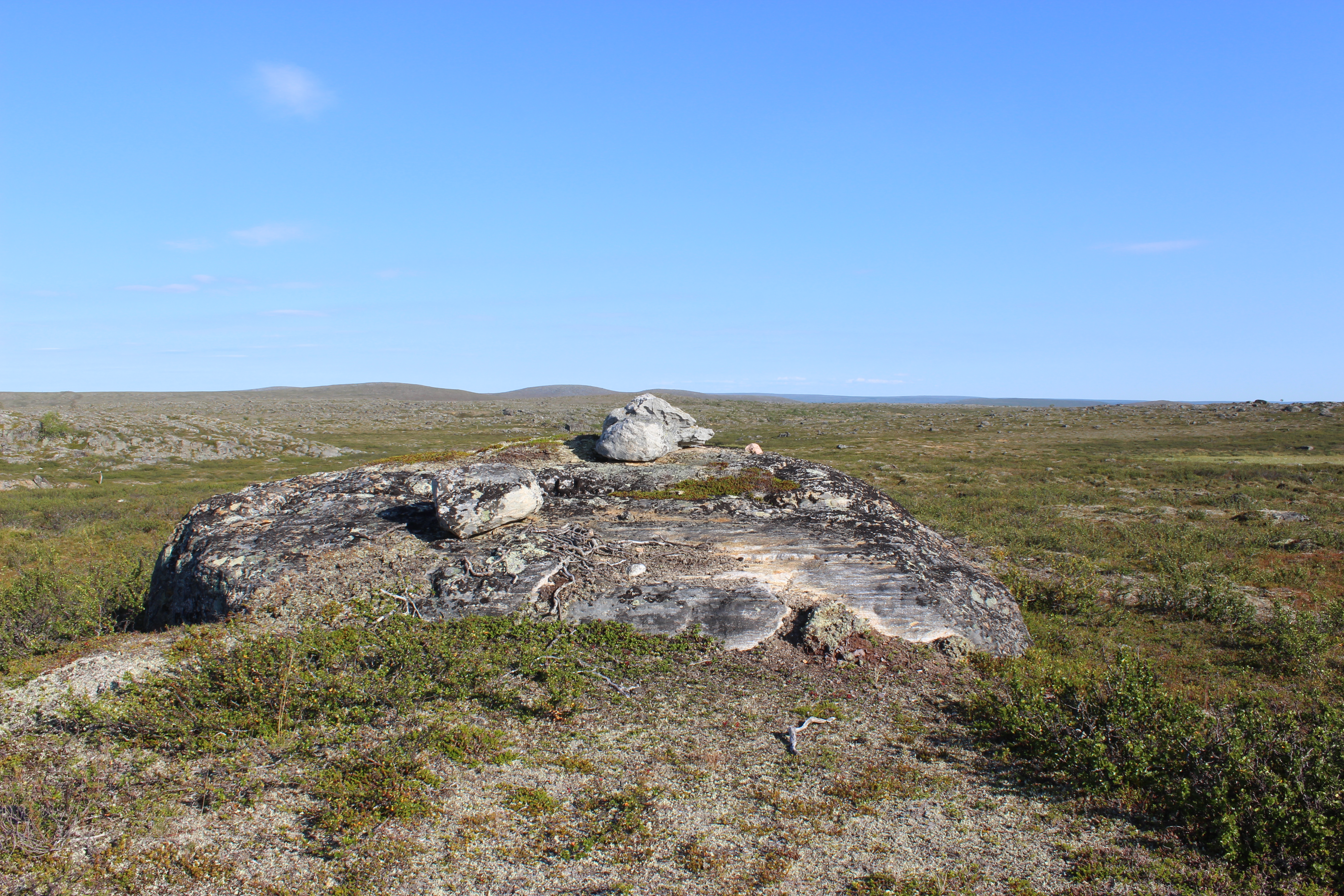 Jätin Kuoppilasjärven kämpän taakseni ja jatkoin kohti Erttetvarria. Matkalla oli todella kuivaa ja karua maisemaa. Istahdin isolle kivelle pitämään taukoa. Huomasin siinä olevan isoja granaattiläiskiä. Vähän matkaa tasaista kuivaa maata talsittuani näin edessäni ison kiven, jonka päällä oli vaaleampi kivi. Lähemmäs tultuani tajusin päällä olevan kiven muistuttavan ihan selvästi suden päätä! Huskyn omistajana innostuin kovasti näkemästäni, aloin hetkeksi ikävöimään koiraani Moskua. Kun kiersin kiven taakse, oli siellä iso luu. Ties vaikka suden jättämä!
