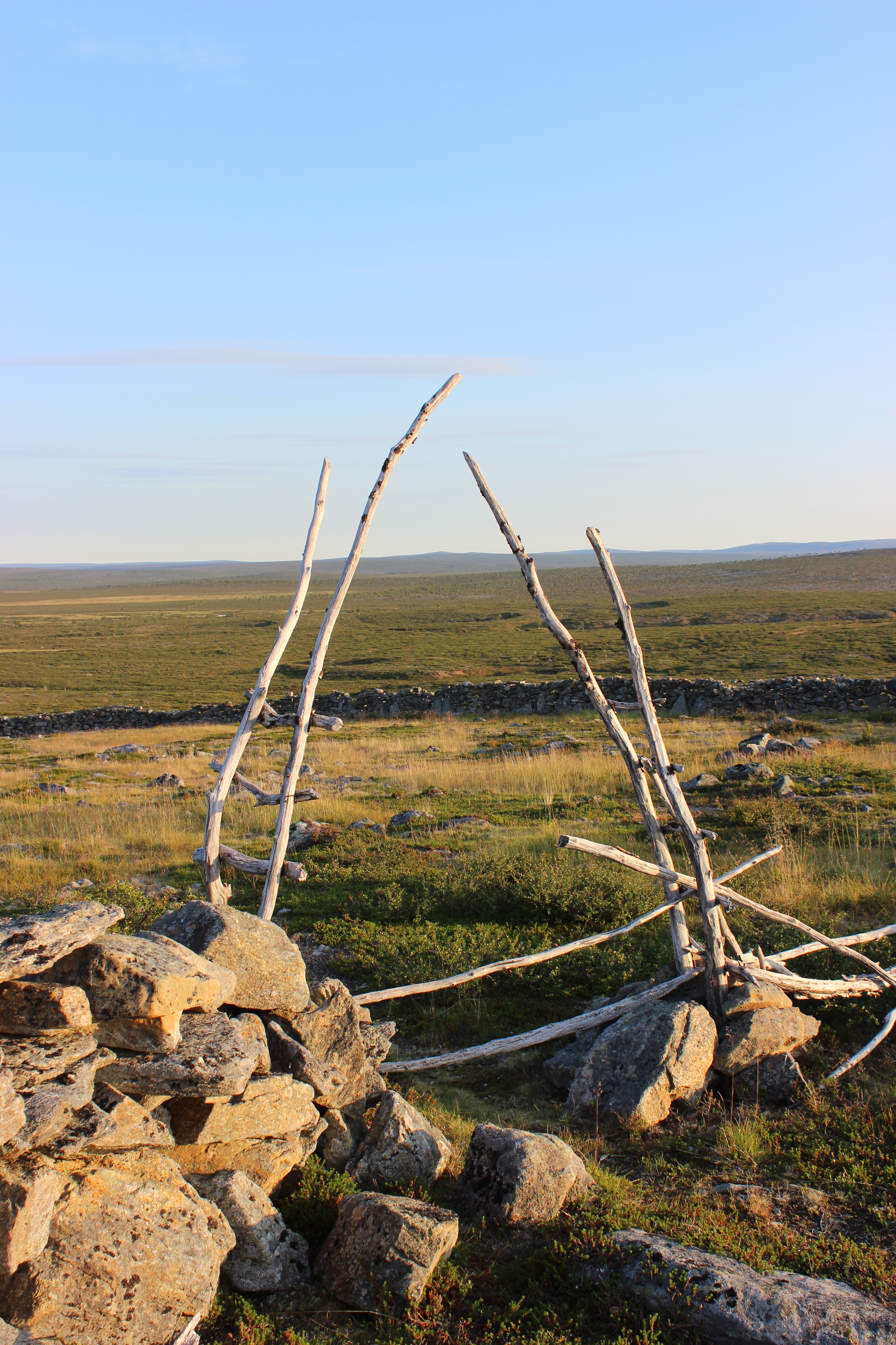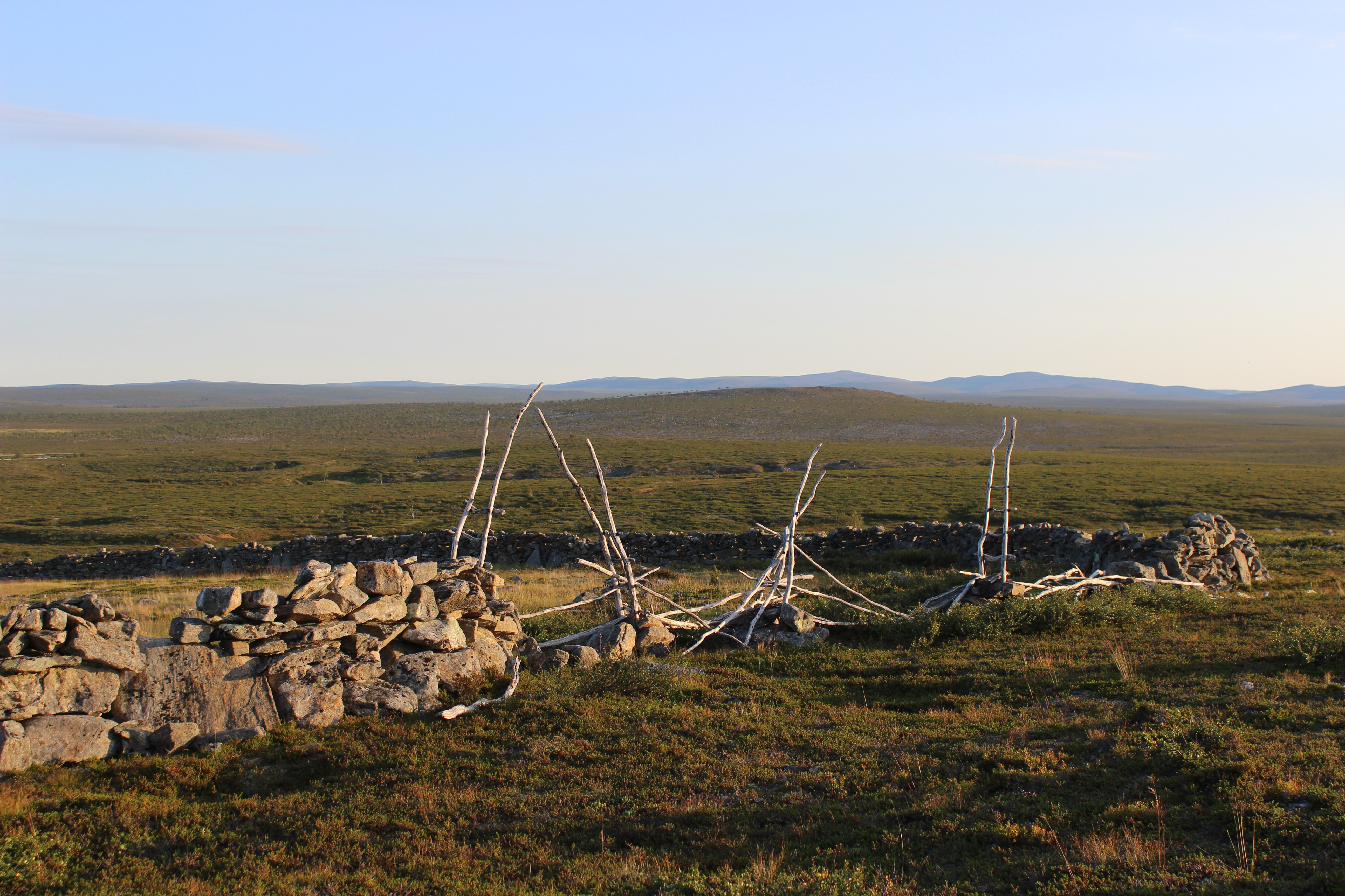 Poroaita oli yksinkertaisesti ihan mieletön! Olin nähnyt paikasta kuvia aiemmin, mutta ne eivät tehneet sille oikeutta. Kymmeniä metrejä kivistä ladottua aitaa mutkitteli keskellä ei mitään. Ne muodostivat kaaren, johon johtavia kiviaitoja oli jatkettu tunturikatajien kuolleilla käppyräisillä rungoilla.