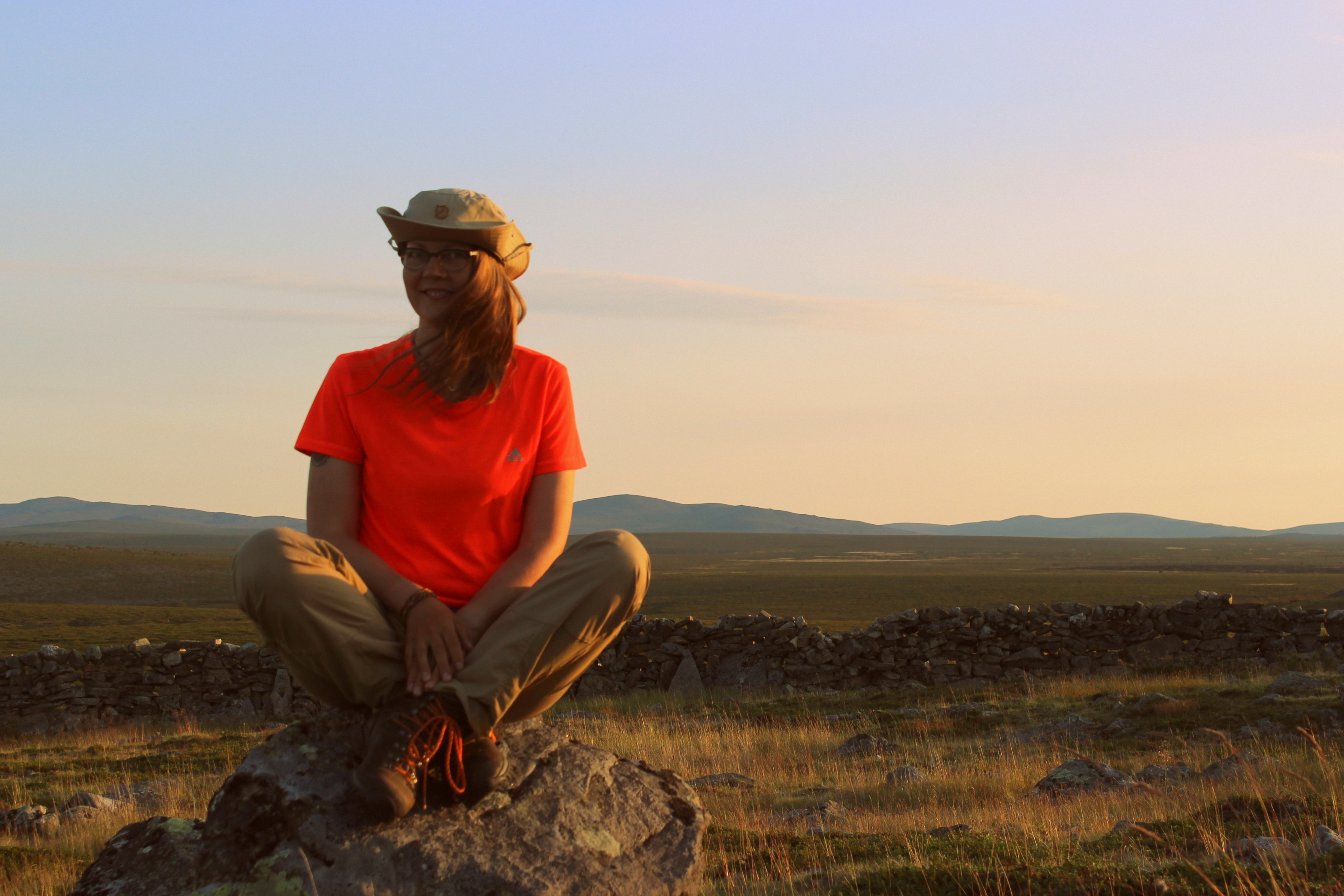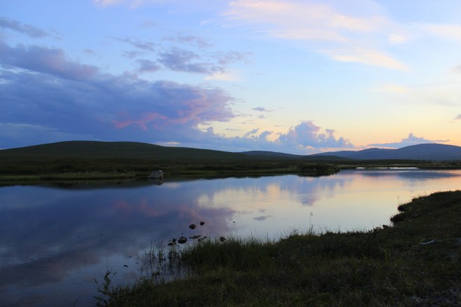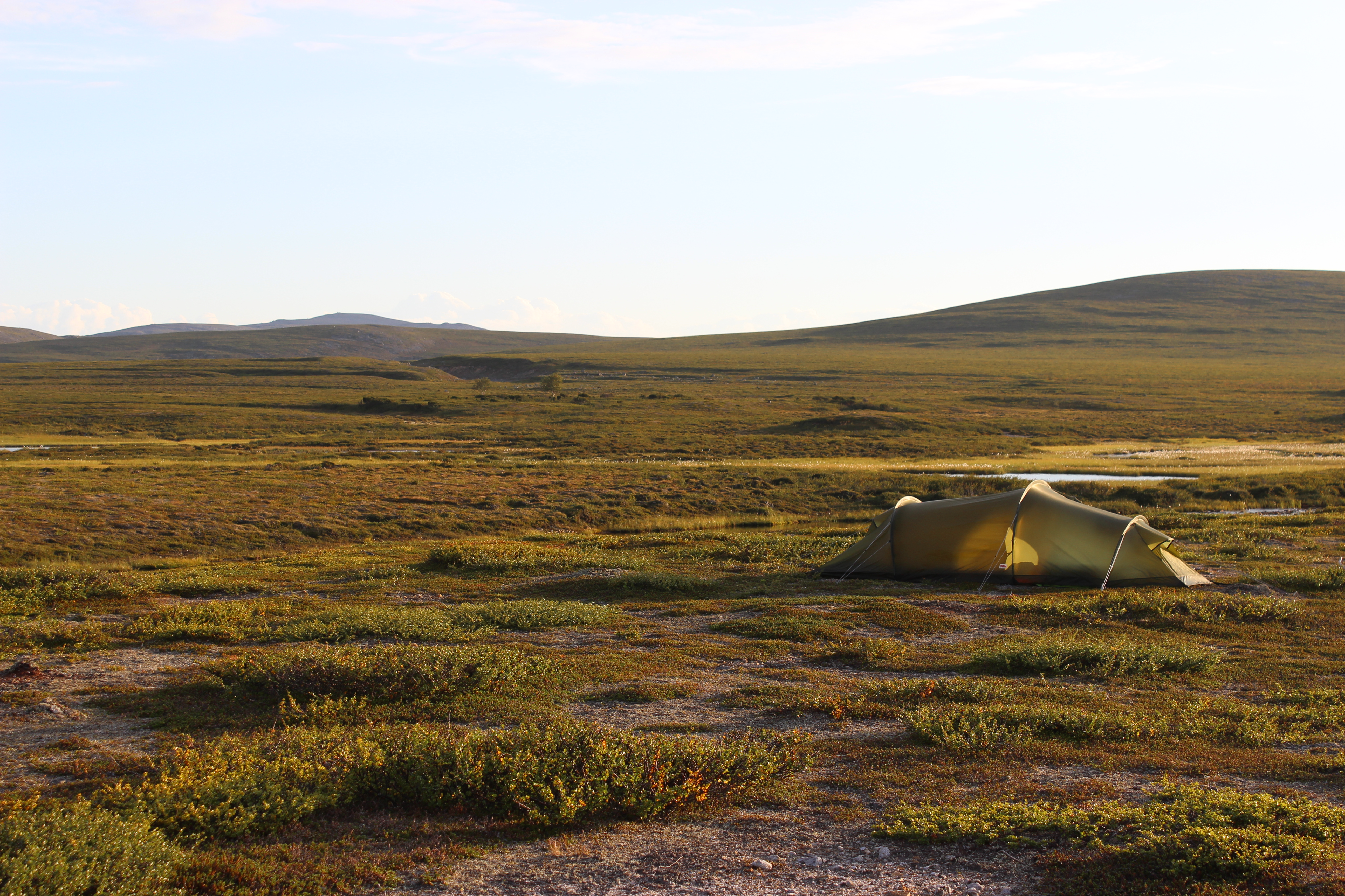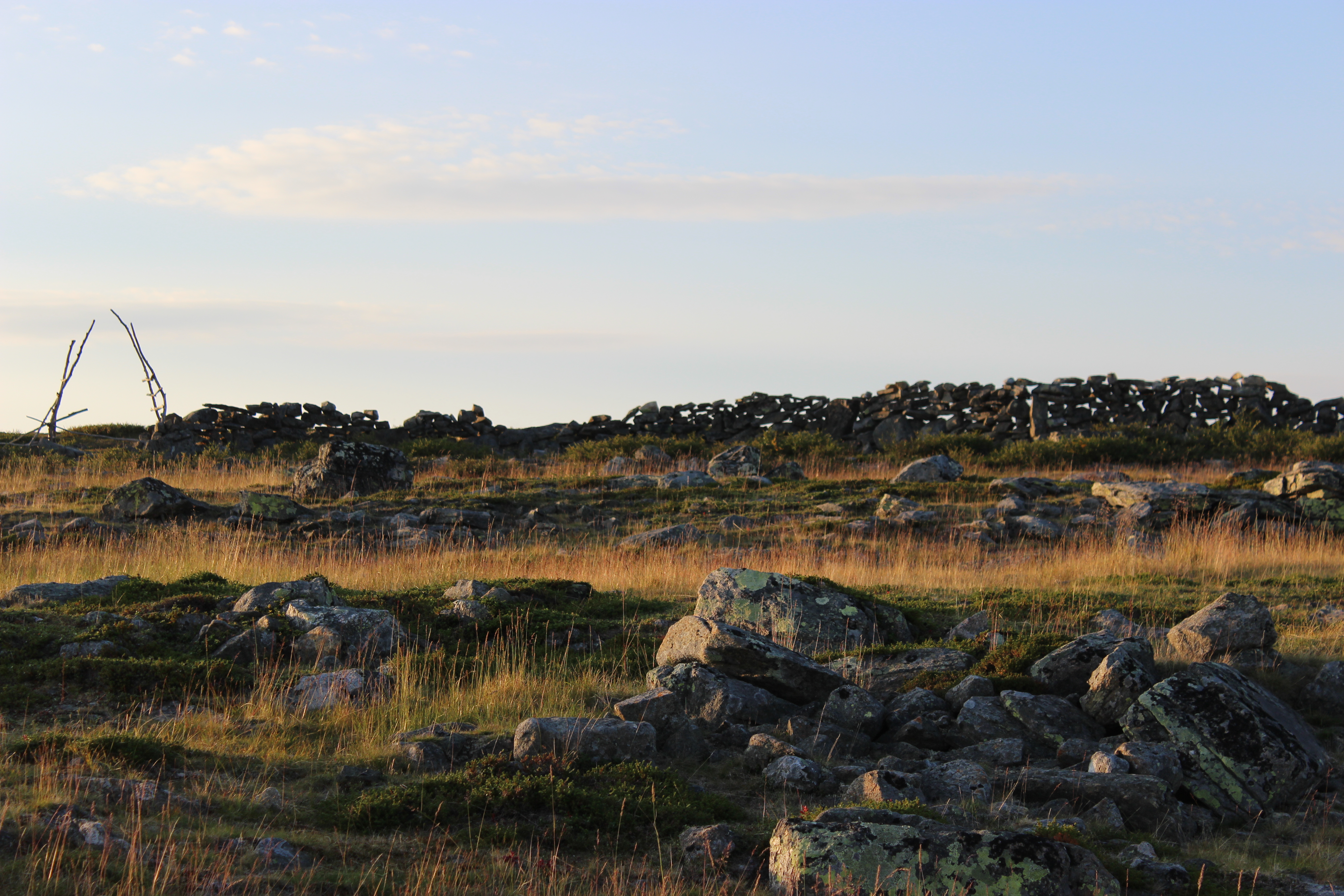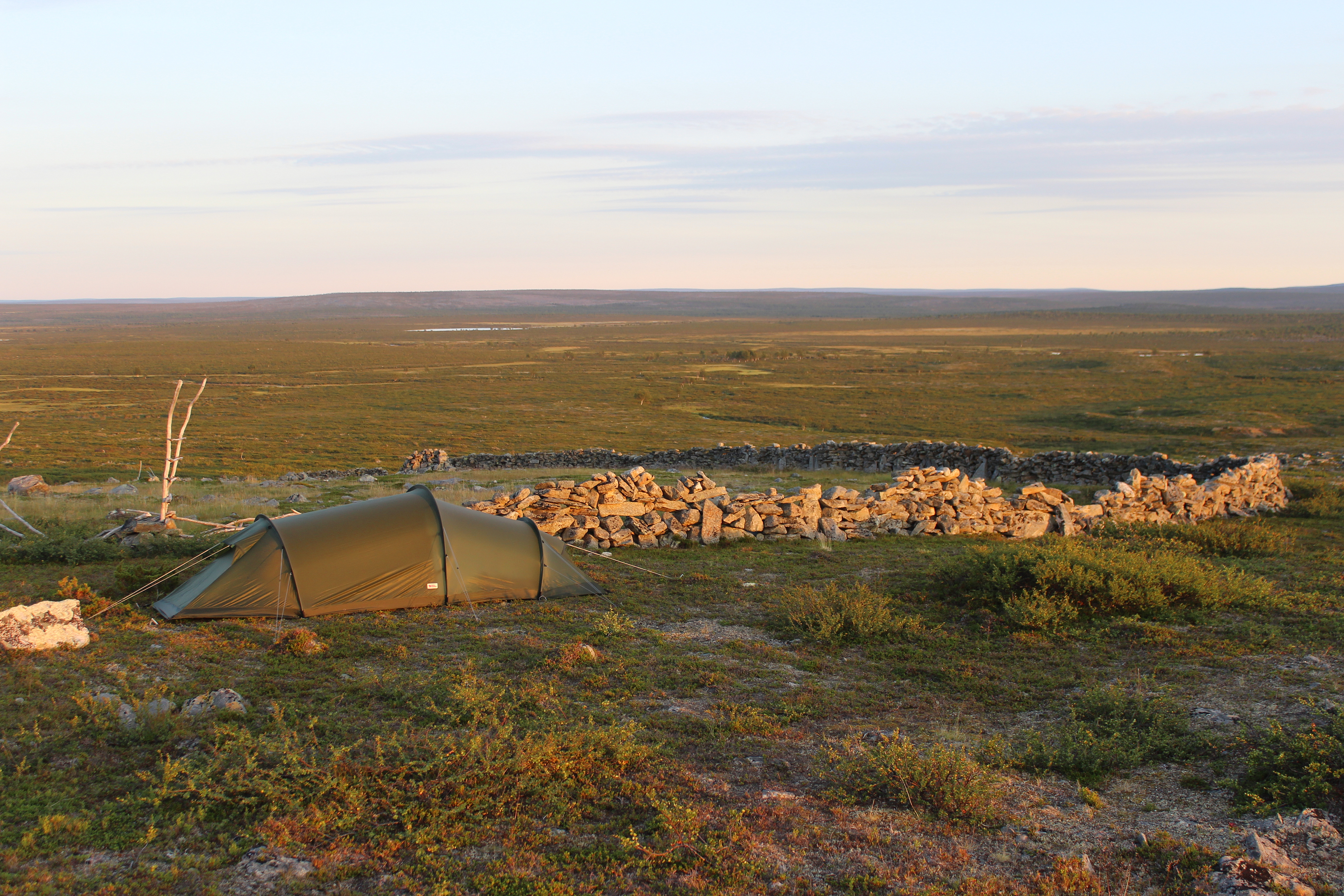 Otin kaiken irti auringon pehmeästä valosta ja otin paljon kuvia. Nälän kouristellessa mahaa aloin etsiä teltalle paikkaa kivisestä maastosta. Se osoittautuikin vähän kinkkisemmäksi operaatioksi… Harkitsin jopa poroaidan sisäpuolella yöpymistä, mutta jotenkin tuli sellainen olo, että se olisi sopimatonta. Löysin paikan ihan poroaidan portin vierestä.