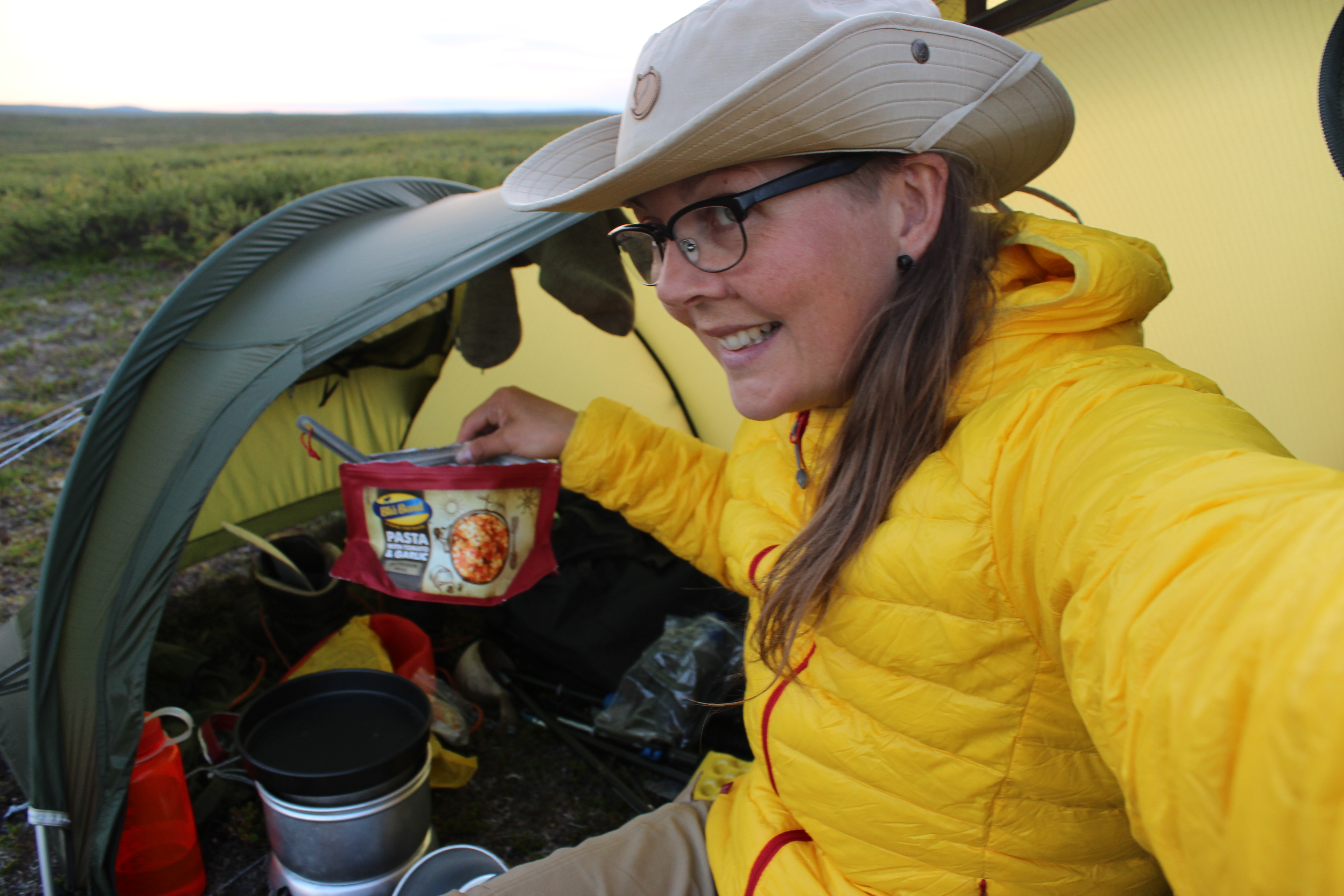Asettelin kaiken paikalleen sillä aikaa, kun BlåBand muhi valmiiksi pussissa. Istuskelin oviaukossa ja söin hyvällä ruokahalulla.
