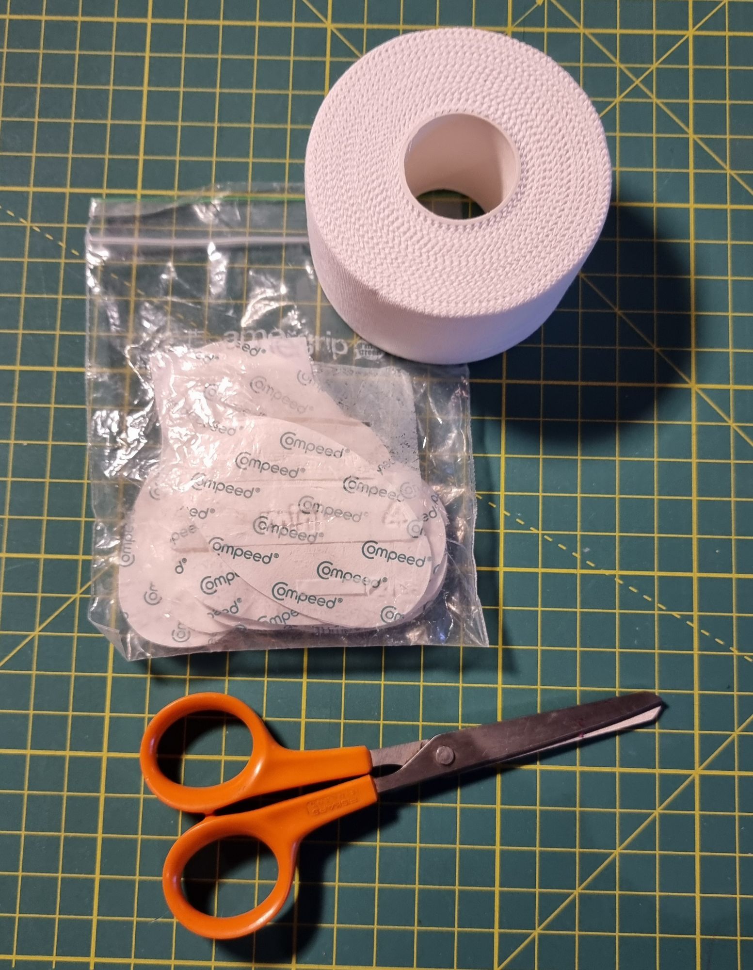 -Rakkojen hoitoon suositellaan yleensä rakkolaastaria. Jos se on toiminut hyvin ennenkin, voit käyttää sitä. Mutta jos jalat hikoilevat paljon ja rakkolaastarit eivät meinaa pysyä paikoillaan, ota haavataitoksia, yksittäispakattuja desinfiointipyyhkeitä, rasvalappuja ja reilu rulla urheiluteippiä. TAI teippaa jalat päivää ennen vaellusta Leukotape P:llä kaikista paikoista, mihin luulet rakkoja tulevan. Urheiluteippiä voi laittaa myös ennakoivasti kesken reissun, tai sillä voi teipata laastarin pysymään paremmin.
